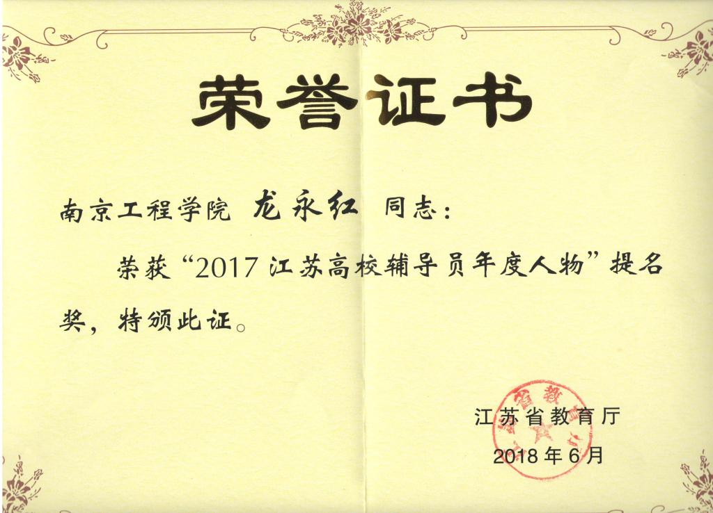 此次评选于今年3月启动,全省122所院校122位辅导员、127所院校221位大学生参加了本次评选。经过两轮专家评审、风采展评、网络推选、实地考察等环节,共评选出“2017江苏高校辅导员年度人物”10名、提名奖20名,“2017江苏省大学生年度人物”10名、提名奖23名,龙永红老师获得“2017江苏高校辅导员年度人物”提名奖,这是威尼斯官网首次获得此项荣誉;严正同学获得“2017江苏省大学生年度人物”提名奖,这是威尼斯官网第2次获得此项荣誉。