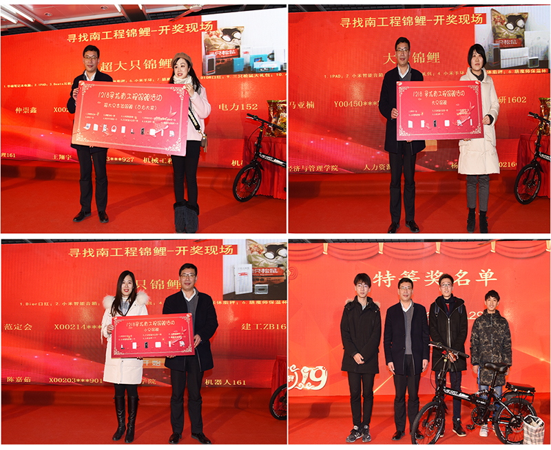 晚上21:00是激动人心的抽奖环节,同学们紧握奖券,期待自己赢取大奖。相关职能部门领导、各学院(中心)领导、学工办主任及分团委书记在现场共抽取一、二、三等奖及特等奖共计133份。奖品包括折叠自行车、小米蓝牙项圈耳机、保温杯、旺旺零食大礼包等。每一位幸运儿的脸上都洋溢着幸福的笑容,激动地迎接了新年的第一份幸运。最后,本次游园会的重头戏“寻找南工程锦鲤”活动压轴登场。张仰飞副院长在现场抽取了一只“超大只锦鲤”、 一只“大只锦鲤”、 一只“小只锦鲤”和20位“幸运小宝”,奖品包括华硕笔记本、ipad、荣耀手机、Beats耳机等。来自电力工程学院的仲崇鑫、研究生处的马亚楠,建筑工程学院的范定会成为本年度南工程锦鲤。此外,校团委微信公众平台推出了为期三天的抽奖活动,采用线上线下同时开展游园会活动的模式,给威尼斯官网学子们带来了新年的欢乐与喜悦。
