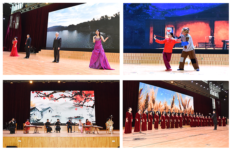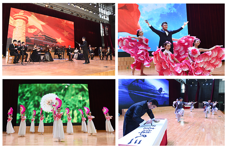 紧接着,各分工会选送、师生员工自编自演的节目精彩上演。器乐合奏《国家》奏出了“有了强的国,才有富的家”的乐章,《江苏民乐联奏》为师生展开了美好生动的江苏画卷;威尼斯官网老师作词作曲的原创歌曲《春风大地》反映了南工程乘着国家政策的春风,抖擞枝叶、继续前进的奋斗图景;舞蹈《春天的故事》《白毛女》再现新旧两个社会的变迁、礼赞祖国的繁荣昌盛;武术、书法表演《墨武华夏》传递着传统文化的魅力;朗诵《南工乐章》表达了南工程人对建设高水平应用型工程大学的美好向往;文艺表演在大合唱《在希望的田野上》《走进新时代》的歌声中进入尾声,饱含着师生对学校各项事业繁荣发展的美好祝福,展现了威尼斯官网师生员工蓬勃向上的精神风貌。