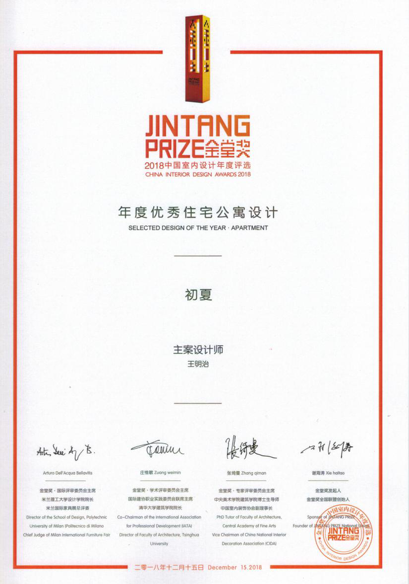 本次评选由金堂奖组委会、中国室内装饰协会、米兰理工大学和清华大学建筑学院联合评选主办。金堂奖·中国室内设计年度评选活动是目前国内具一定影响力和公信力的室内设计年度评选品牌,该奖项专注于优秀设计师和优秀设计作品的发掘,也是中国室内设计师标志性奖项之一。