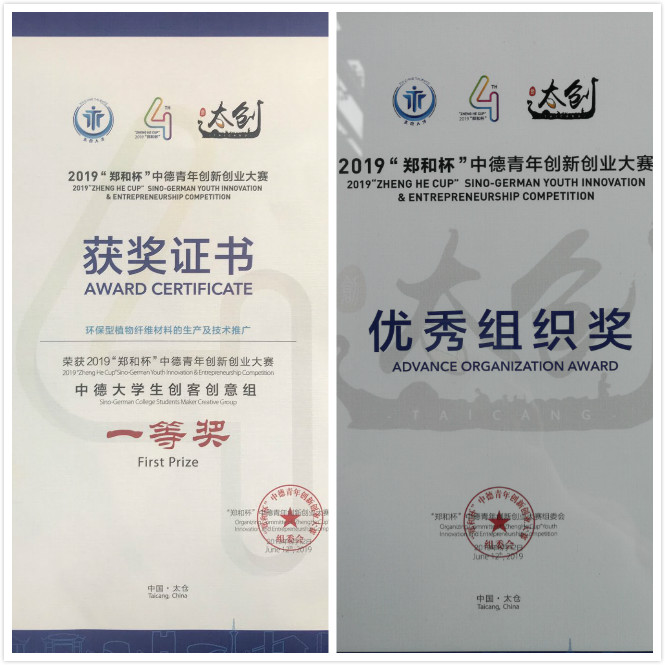 2019“郑和杯”中德青年创新创业大赛总决赛于6月11日-12日在江苏太仓举行。经过层层筛选、资格审查、网络初审,共有64个中国和德国项目在300多支参赛队伍中脱颖而出进入决赛。威尼斯官网材料工程学院夏源、巫艳两位同学凭借参赛作品“环保型植物纤维材料的生产及技术推广”(指导老师:张克杰 张春祥 杭祖圣)获得大学生创客创意组一等奖。