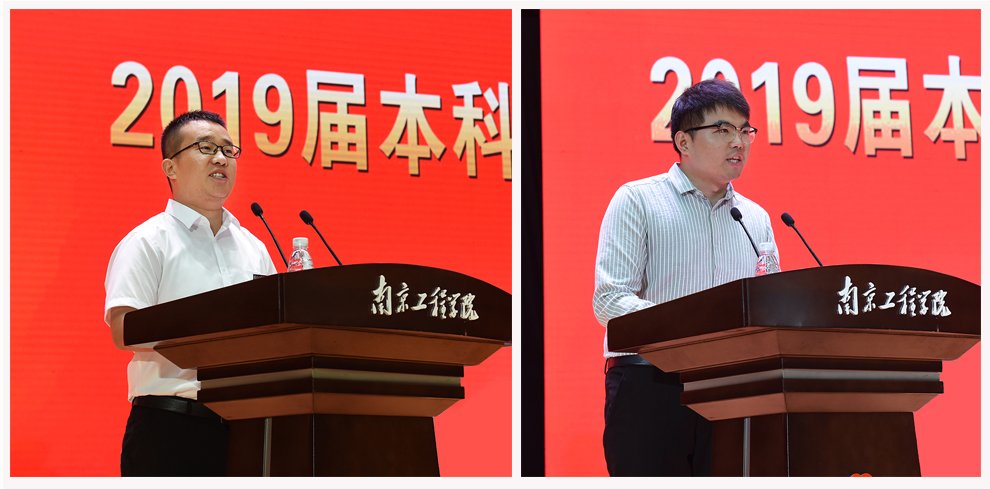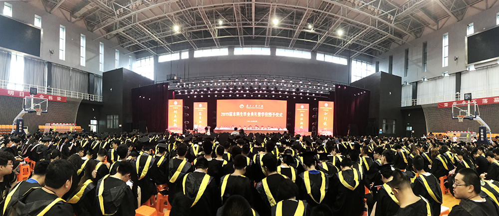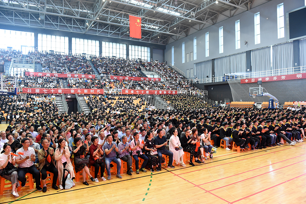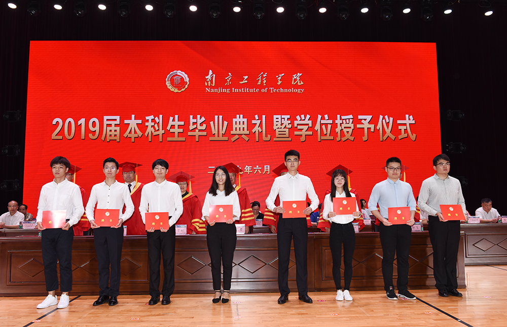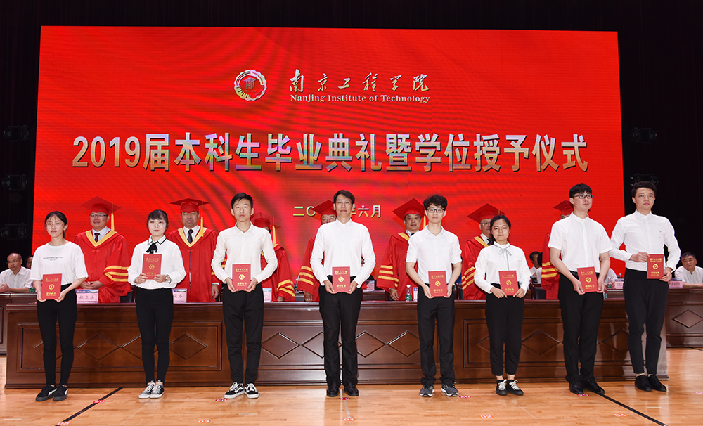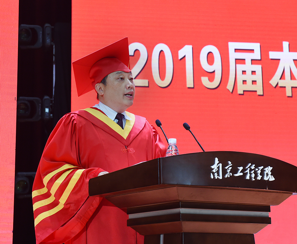 毕业典礼上,校党委副书记、院长史金飞代表学校深情寄语全体毕业生。他说,培桃育李、涵育英才,是大学之根本。四年来,同学们与学校共同成长,见证了学校发展的点点滴滴。学校办学条件在全国高校中名列前茅,被评为南京市最美高校第一名,江苏省平安校园建设示范高校;第一志愿录取率连年100%,且从2018年起,在江苏省招生整体调整到本一批次;去年获得江苏省科学技术奖10项,获奖总数居全省高校第7名;5月份,中共中央政治局委员、国务院副总理孙春兰参观调研了威尼斯官网创新创业学院和大学生创业园,对威尼斯官网探索的“从高水平专科到应用型本科再至专业研究生”的特色化、高质量发展道路,和以项目化教学为牵引,创新应用型本科人才培养模式改革,推进创新创业教育,提升高水平应用型人才培养质量等方面的理念与做法给予了高度肯定。学校的发展与进步都凝聚着同学们贡献的青春智慧与无限活力,是一代代南工程人凝聚智慧、共同奋斗、无私奉献的结果。“今年是中华人民共和国成立70周年,以青春之我,创青春之国,创青春之民族,同学们已经站在历史的关键点上,作为国之栋梁,理应担起新时代重任。”在同学们即将走出校园、走进社会之际,史院长希望同学们要坚定理想,心向远方;要脚踏实地,砥砺前行;要勇于担当,创新创业。希望大家牢记国家使命和母校的嘱托,用不懈的努力书写精彩的人生。