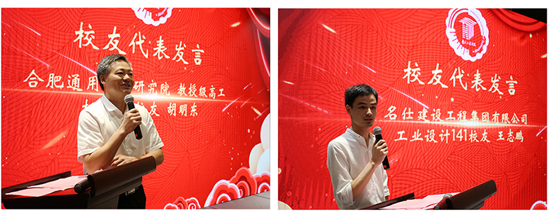 机7905班胡明东、工业设计141班王志鹏分别作为不同时期的校友代表作了交流发言,他们深情地回顾起在母校的学习、生活以及为他们传道授业解惑的恩师们,感恩母校提供了人生和事业的基础。他们表示将立足各自的工作岗位,顽强拼搏,开拓进取,以优异成绩报答母校,与母校携手并肩,共创美好的未来。