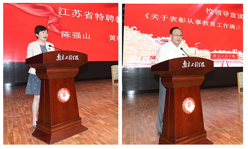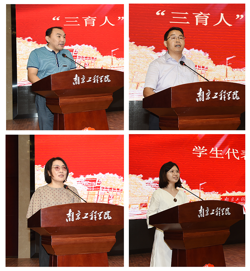 围绕“庆祝新中国七十华诞,弘扬新时代尊师风尚”这一主题,电力工程学院章心因老师作为“三育人”先进个人代表,材料科学与工程学院查光成老师作为“三育人”先进集体代表,人文与社会科学学院严蓓蓓老师作为教师代表分别作了发言。他们用质朴的语言表达了对立德树人的理解和责任担当、对南工程每一名学子的无限深情、对学校发展壮大的热切期盼。经济与管理学院蔡雯欣同学与大家分享了她与老师的点滴故事,感谢老师们用言传身教为学生开启求知的大门、成就了学生的多元发展,她代表南工程广大学子向老师们送上深情祝福。