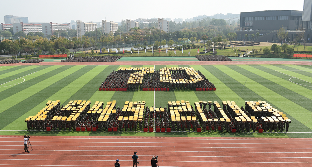 在今年的新生开学典礼暨军训汇演中,除了军训会操传统项目,还融入主题教育元素,近1500名参训学生用队列编排出的“1949-2019”“70”“两弹一星”“1978·春天的故事”“HK•MC”“2008”“新时代”“中国梦”“南工梦”“大学梦”“我的梦”“不忘初心,筑梦前行”“祖国万岁”等字样以及党旗、国旗、地图、火箭、五环、“一带一路”等图案,回顾新中国的辉煌成就,以此表达对祖国母亲的热爱和不忘初心、勇担使命的信心和决心。