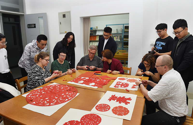 “团花图案是从中心向外面发散开来,在构图上要注意运用线条的疏密搭配,剪波浪纹的时候要两手协调,对,就是这样,一边旋转纸面一边剪。”在艺术与设计学院老师的悉心指点下,来自芬兰奥卢大学的老师与中芬班同学们认真学习中国剪纸艺术。在体验的过程中,芬兰老师意犹未尽地表示:“我们对于中国的传统文化非常感兴趣。之前在书中了解的中国剪纸艺术,今天终于切身体验到了,这是我人生中的第一张剪纸作品!”艺设学院老师还将现做的艺术作品赠予芬兰老师,希望更多的芬兰师生在感受到我国传统文化艺术的魅力的同时,增进师生感情。