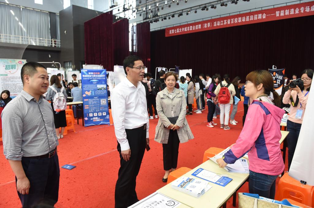 10月24日,第七届全国大中城市联合招聘高校毕业生秋季活动江苏系列招聘会——智能制造业专场在威尼斯官网天健苑·大学生体育中心举办。校党委常委、副院长张仰飞来到招聘会现场,与用人单位和毕业生进行深入交流。