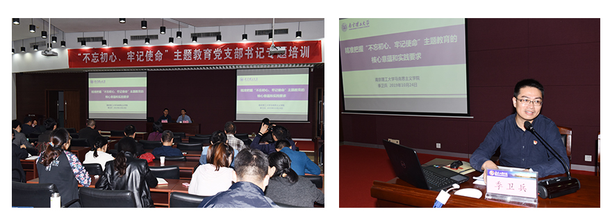 培训班分别邀请东南大学马克思主义学院教授、博导叶海涛,东南大学马克思主义学院教授、博导、江苏省中国特色社会主义发展研究院首席研究员刘魁,南京理工大学马克思主义学院党委书记、研究员、博导季卫兵作《我们的“初心”我们的“使命”——以中国共产党历次全国代表大会为例》《习近平新时代中国特色社会主义思想专题》《精准把握“不忘初心、牢记使命”主题教育的核心意蕴》三场专题辅导报告。组织党支部书记赴雨花台烈士陵园开展重温入党誓词现场教学,学习《党章》《中国共产党支部工作条例(试行)》《中国共产党党员教育管理工作条例》。