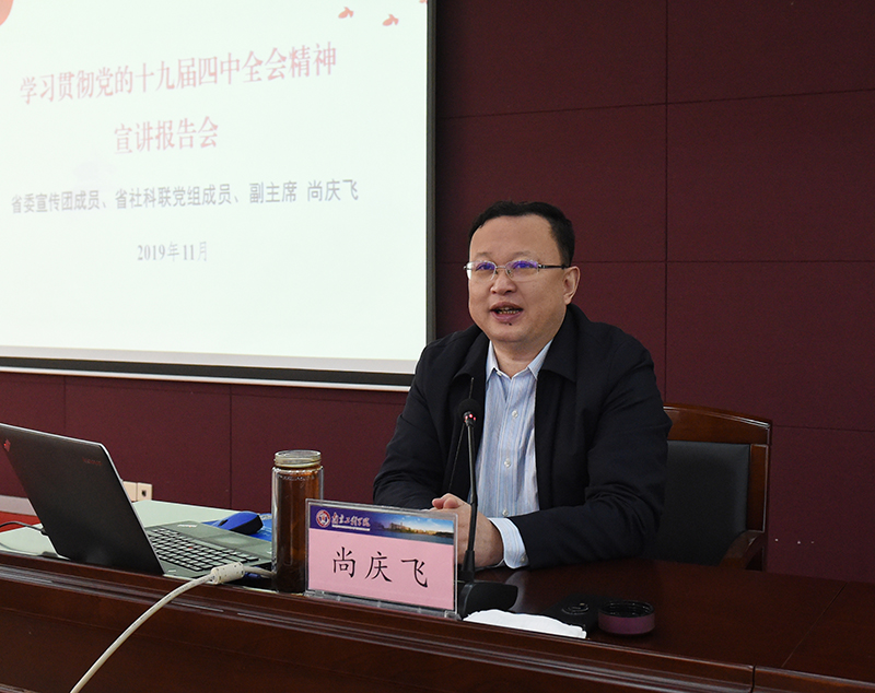 报告会上,尚庆飞从“全会的基本情况和重要成果,全会的重大意义,坚定中国特色社会主义制度自信,全会《决定》提出的总体要求、总体目标和重点任务,贯彻落实好全会精神”五个方面对党的十九届四中全会精神进行了全面、系统、深入的宣讲。他指出,这次全会是我们党站在“两个一百年”奋斗目标历史交汇点上召开的一次十分重要的会议,是在新中国成立70周年之际,我国处于中华民族伟大复兴关键时期召开的一次具有开创性、里程碑意义的会议。全会最重要的成果是审议通过了《中共中央关于坚持和完善中国特色社会主义制度 推进国家治理体系和治理能力现代化若干重大问题的决定》,全面回答了在我国国家制度和国家治理体系上“坚持和巩固什么、完善和发展什么”这个重大政治问题。