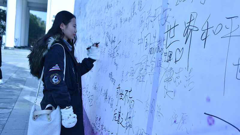 “不忘初心,牢记使命”“愿世界和平”“国之殇,民之痛,吾辈自强”“你们永远活在人类的记忆里”……在南京大屠杀死难者国家公祭日“和平许愿墙”前,过往的师生纷纷驻足,写下对和平的期盼和对逝去同胞的缅怀。“民族的苦难我们要永远铭记,所谓纪念,从来都不是为了宣扬复仇的怨念,只为许下复兴的心愿。我们青年人也要携起手来,将和平的种子撒向世界每个角落。”交控172班王意诚同学这样说到。
