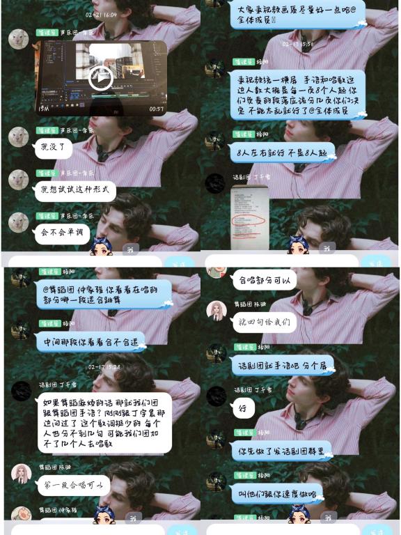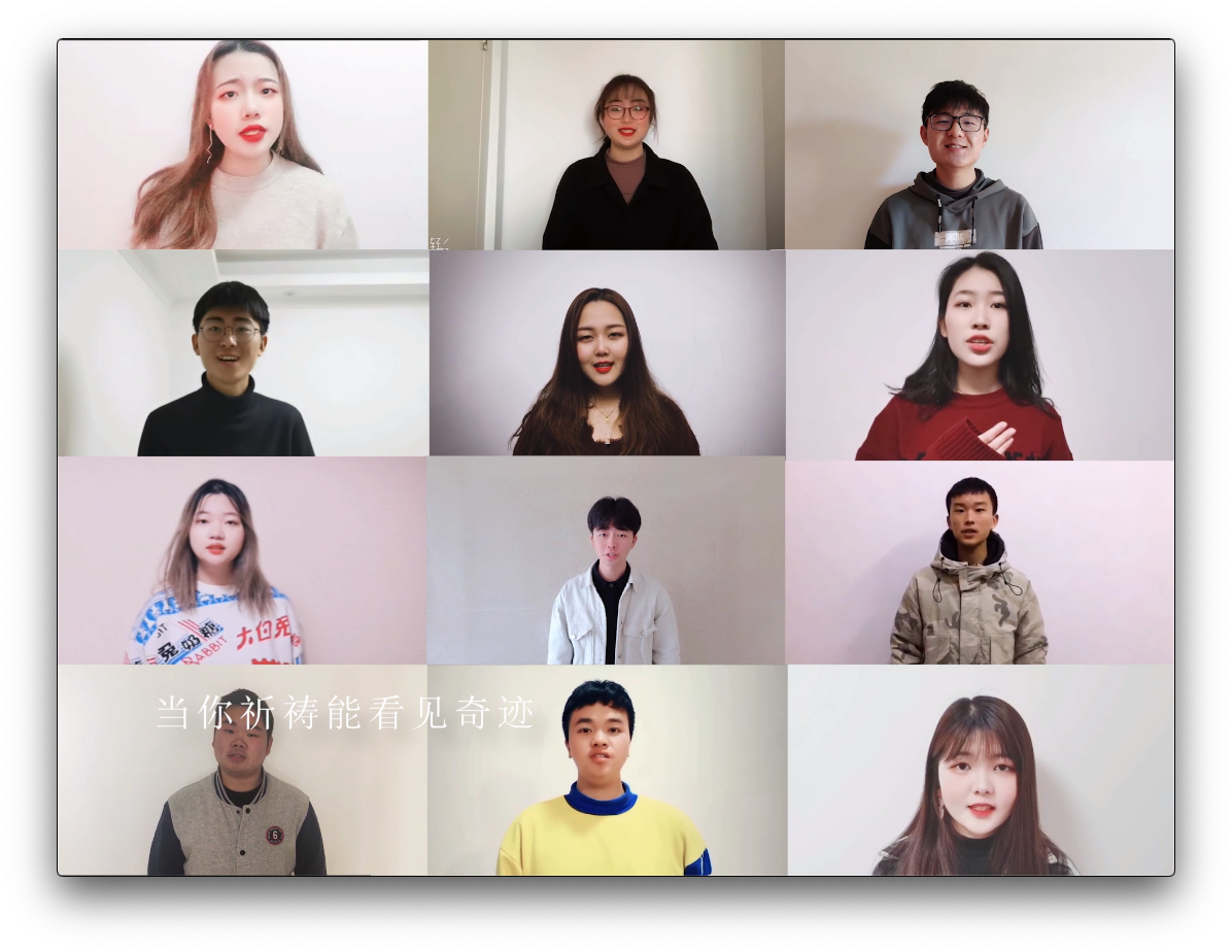 大艺团艺术总监、社保171班常乐“挑”起了视频制作的担子,“其实在录制过程中,我们还克服了诸多困难:遥远的地理距离,简陋的录音设备,第一版里参差不齐的和声……可不管怎样,我们大家赤诚的心是在一起的。”制作组里,不少同学都是第一次尝试视频剪辑。他们说:“跟着网络教程现学现做,虽然技术有限,但能够在这个非常时期为这场特殊活动出一份力,感到很满足、很骄傲。”