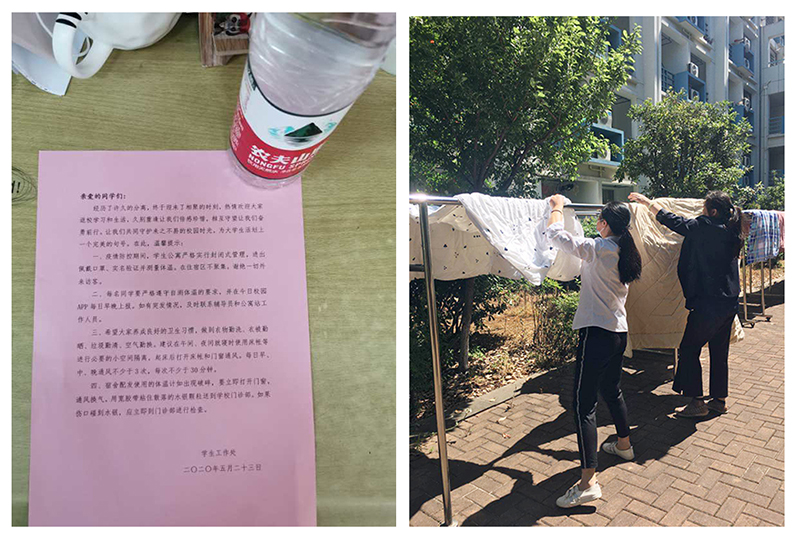 为了营造温馨舒适的住宿环境,返校前学生宿舍已经进行多次开窗通风,卫生保洁,公共区域都进行了卫生清整、消毒杀菌。阿姨们为同学们晒被子、甚至帮助打理植物的照片每每被同学们在朋友圈晒出,同学们都称“阿姨太贴心了,又温暖又感动”。学校为每个学生宿舍配备了一只体温测量计、发放温馨提示单,还贴心地为每位返校同学准备了一瓶矿泉水。有同学说,“虽然不是什么贵重东西,也很暖心啦!”