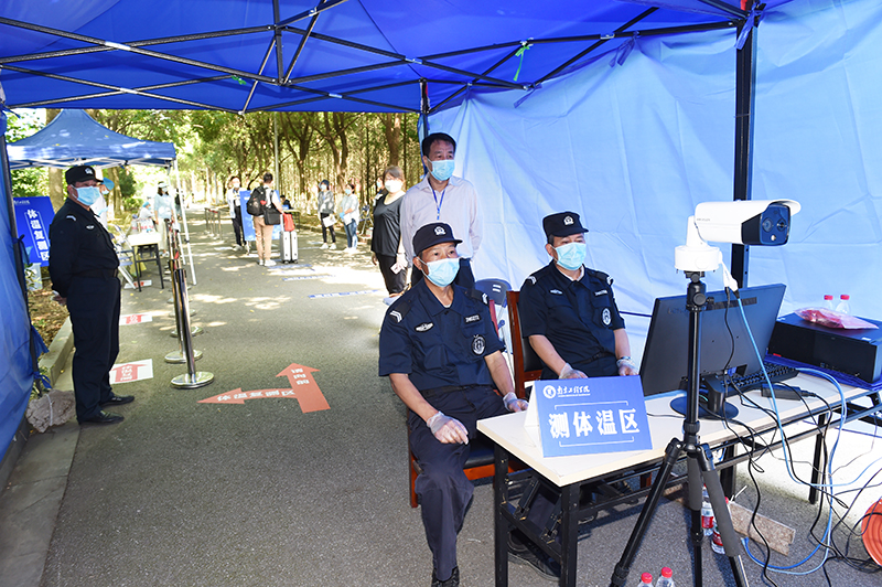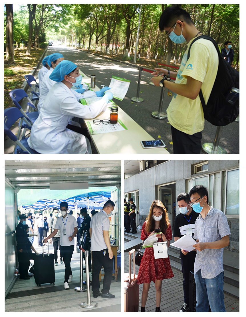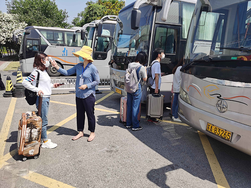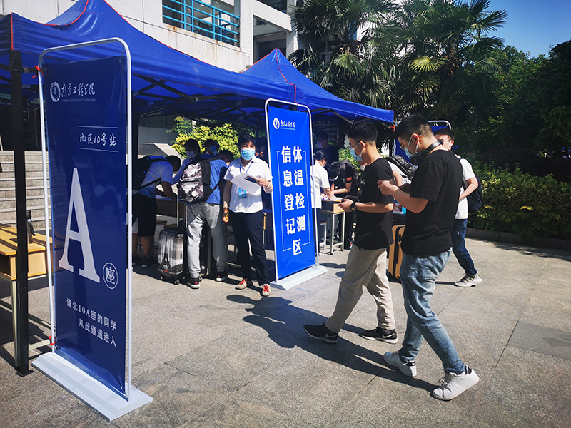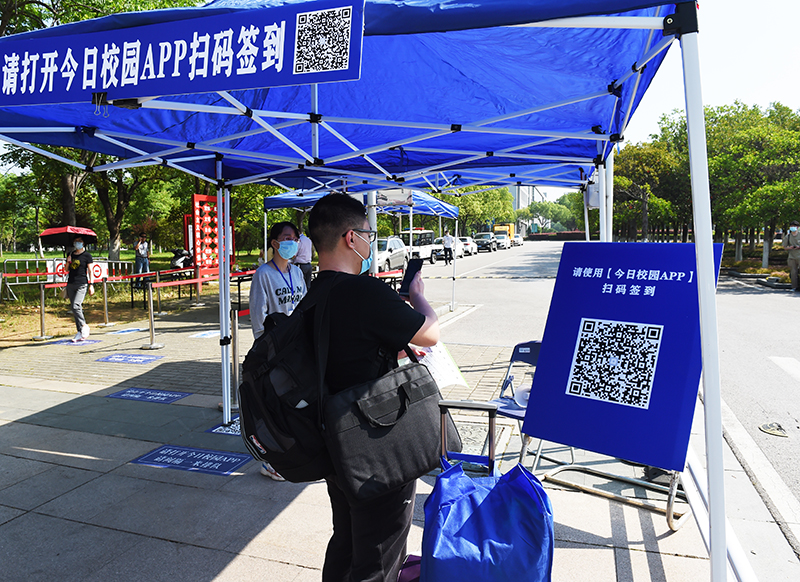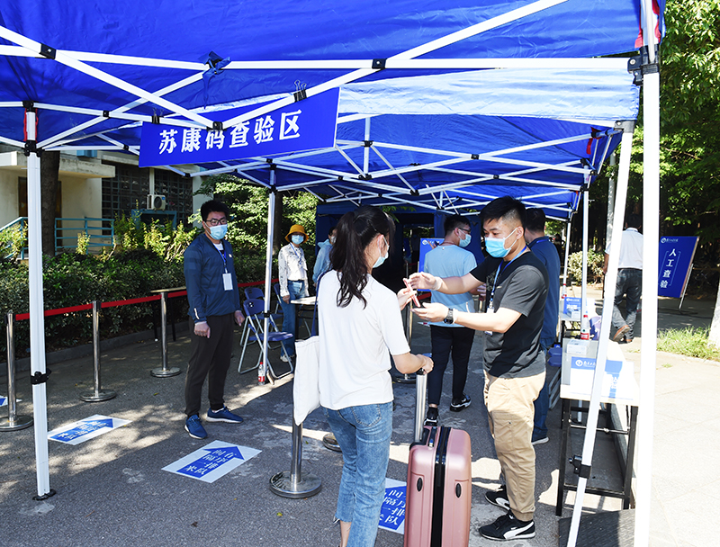 根据学校安排,开放二号门、三号门、四号门迎接学生入校。返校当天,三个校门口都设置了一长排蓝色的遮阳棚,测体温区、APP扫码签到处、人工查验区、乘车点等蓝底白字的标志十分醒目,被学生们称为暖心的“工程蓝”。“请间隔一米排队等候”“请等待测温”“请使用今日校园App扫码签到”“请打开苏康码并出示校园卡或身份证”“请到乘车点,小公交会送您去宿舍”……校门口,由学工队伍、保卫处、网络与信息中心、门诊部、后勤保障处等组成的工作人员有序迎接归家的学子,他们热情引导着返校学生依次完成每一个步骤与程序。在每栋宿舍的入口,宿管人员再次对学生进行身份核验、测量体温和核验信息,对行李进行消毒。据工作人员介绍,为提高工作效率,精准制定返校预案,返校之前,各学院(中心)提前一一与学生联系,确定返校车次与返校时间。为优化返校细节,学校多次组织了返校演习操练,确保各项操作科学规范,返校流程清晰便捷。返校当天上午七时许,就有学生迎着朝阳入校;晚上十一点多,还有学生踏着夜幕归来。错时分流,也避免了人员聚集的情况,从入校、接驳到进入宿舍,学生们积极配合着工作人员进行查验,返校过程井然有序。
