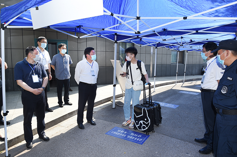 上午9点,党委书记史国君,党委副书记、院长史金飞,党委副书记刘志远,党委常委、副院长张仰飞等领导先后来到二号门、三号门、四号门报到现场,实地查看毕业生返校情况并与返校学生亲切交流。校领导感谢工作人员为学生平安返校付出的辛勤劳动,并反复叮嘱大家,要严格落实防控工作要求,毫不松懈、全力以赴做好入校时、复学后的各项服务保障工作。史书记强调,“学生是学校的主体,是学校一切工作的重心和重点,我们一定要把责任担起来、让工作实起来,要把工作做到细处、做到学生心里,让学生返校就有回家的感觉,确保返校复学各项工作的安全、有序运行。”