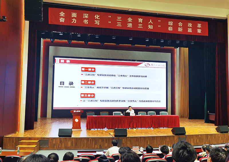 史国君书记的报告分“探索与回顾”“原则与思路”“路径与方法”三个部分,全面回顾了五年来学校深入践行“三全育人”理念,深入扎实开展“三进三知”专题实践活动取得的育人成果,探讨了深入推进“三全育人”综合改革的原则和思路,并就下一步深入开展“三进三知”专题实践活动,实现思想政治工作质量提升指明方向、提出方法。