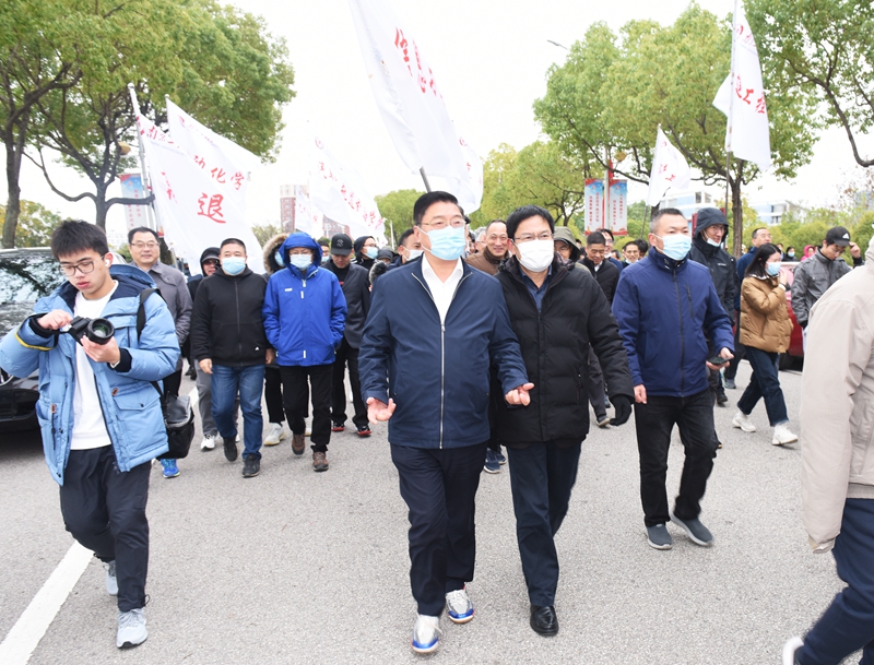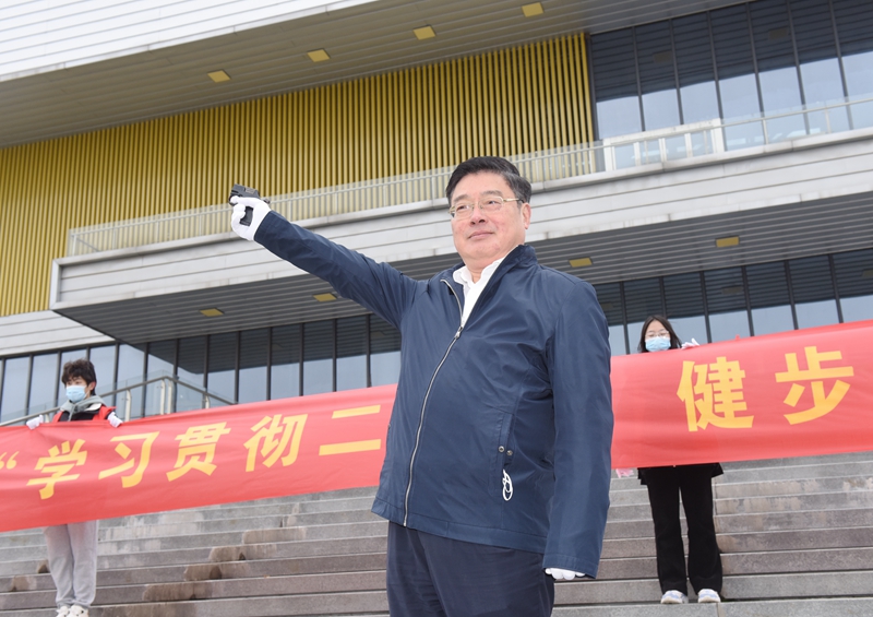 在天健苑·体育中心广场的活动起点上,党委书记史国君为校园“健身走”活动鸣枪发令。党委副书记濮励杰为大家带来问候和祝愿。他指出,健身走是一项风靡全世界的“绿色、环保、时尚、健康”的大众有氧运动,在当前常态化疫情防控背景下,也是一项有利于全民健身的活动。自2017年健身走活动举办以来,校领导带头参与、广大教职工积极响应,已成为学校一项覆盖面最大、参与人数最多、影响范围最广的教职工特色文体活动。希望广大教职工走起来、乐起来、强起来,在党的二十大精神指引下,把从体育锻炼中迸发出来的激情转化为推进学校各项事业高质量发展的动力。