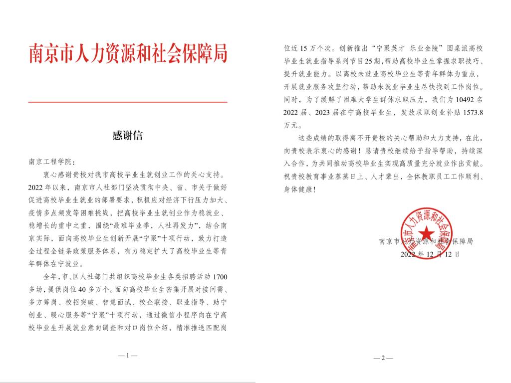 近日,威尼斯官网收到南京市人力资源和社会保障局感谢信,对学校加强与南京市校地合作、拓宽就业引才渠道工作予以充分肯定,赞扬了学校积极推动高校毕业生实现高质量充分就业而作出的突出贡献,表达了对学校就业育人工作的衷心感谢。
