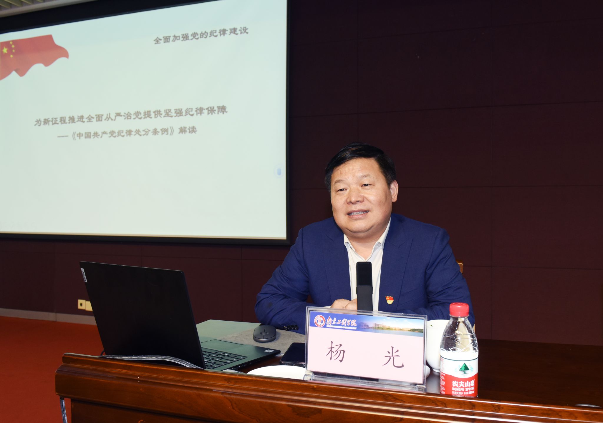 杨光以“为新征程推进全面从严治党提供坚强纪律保障”为题,从什么是党的纪律、《中国共产党纪律处分条例》的修订历史、修订意义以及如何准确把握《条例》的精髓要义,确保《条例》贯彻落实等方面,结合大量鲜活案例对修订后的新《条例》进行了解读。报告站位高、视野广,案例翔实、剖析深刻,案情发人深省、深受教育,警醒党员干部要吸取教训、以案为鉴、警钟长鸣,时刻把纪律和规矩挺在前面,自觉把铁的纪律刻印在脑海中、体现在行动上,始终做到忠诚干净担当。