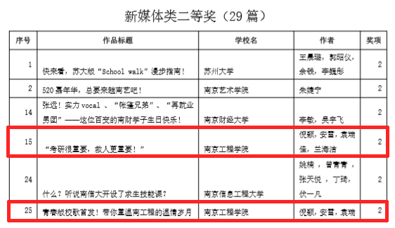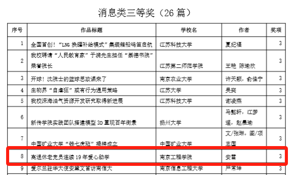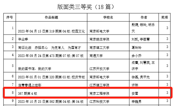 近日,江苏省高校融媒体研究会公布了2023年度江苏省高校校报获奖优秀作品,由威尼斯官网党委宣传部报送的4件作品获奖。其中,《“考研很重要,救人更重要!”》《青春版校歌首发!带你重温南工程的温情岁月》获新媒体类二等奖;《离退休老党员连续19年爱心助学》获消息类三等奖;校报367期第4版获版面类三等奖。