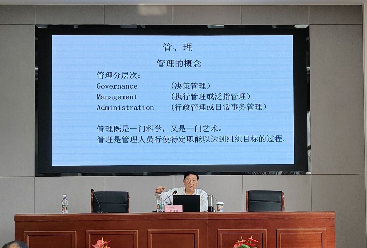 “管理既是一门科学,又是一门艺术。”赵曙明教授从数智时代对当下人才培育带来的挑战切入,简要介绍了管理基本概念,并深度剖析了恩师彼得·德鲁克的管理思想,在他的生动讲述中,师生们仿佛与管理大师进行了一场跨时空的对话。“人是可以塑造的;做学问要先会做人;吃苦是一种能力;三人行、必有我师;帮助他人就是帮助自己;人要有知识、也要有见识、胆识和共识;要想成功,就要学会瞄准方向、抬头看路、低头拉车!”围绕“如何管理自己这一主题”,赵教授讲述了“了解自己、关心他人、学会融合”三个方面内容,并结合留学和归国后的经历,分享了自己的管理感悟和人生随想。