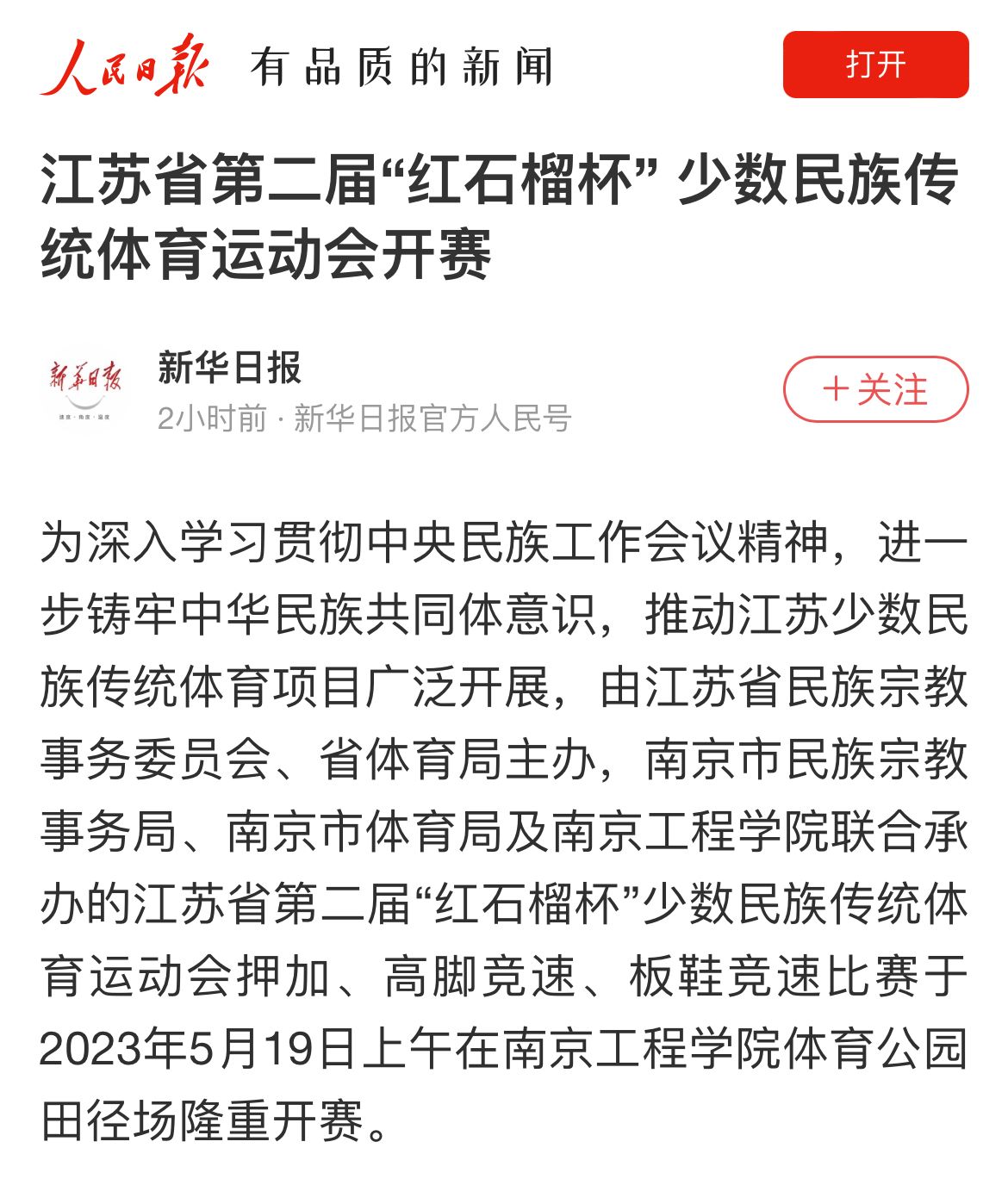 为深入学习贯彻中央民族工作会议精神,进一步铸牢中华民族共同体意识,推动江苏少数民族传统体育项目广泛开展,由江苏省民族宗教事务委员会、省体育局主办,南京市民族宗教事务局、南京市体育局及威尼斯7026官网联合承办的江苏省第二届“红石榴杯”少数民族传统体育运动会押加、高脚竞速、板鞋竞速比赛于2023年5月19日上午在威尼斯7026官网体育公园田径场隆重开赛。