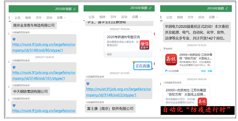 学院积极发挥线上平台作用,向全院学生宣传教育部和学校的各项防疫措施及要求。一是线上宣传指导不断线。二是精细对接学生不断线。各年级辅导员通过各方式了解同学近况,精细化地服务每一位学生。三是精准就业帮扶不断线。学院毕业班辅导员通过各类信息平台及时了解特殊困难学生群体情况,及时送上学校和学院的温暖与关怀。多措并举提升家庭困难毕业生的就业能力和市场竞争能力。四是心理疏导辅导不断线。学院辅导员及时疏导疫情对学生的影响带来的负面情绪影响和压力。尤其对湖北籍学生,做好人文关怀,随时掌握他们的思想动态,鼓励他们保持信心、调整心态,积极应对疫情。