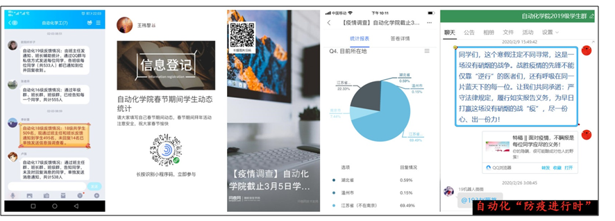 自动化学院全体教职员工群策群力,各年级辅导员、班主任、第二班主任老师义无反顾迅速投身防控工作第一线,为夺取抗“疫”全面胜利贡献力量。各班级班主任、第二班主任充分利用网络化云端平台,智能化在线统计等途径,“一对一”、“点对点”密切联系学生,对重点疫区学生及与重点疫区人员接触的同学情况进行地毯式排查。认真落实“日报告”、“零报告”、“零延迟”制度,学生工作队伍力求做到“早预防”、“早部署”、“早准备”,定期召开“疫情防控”专题“云会议”。