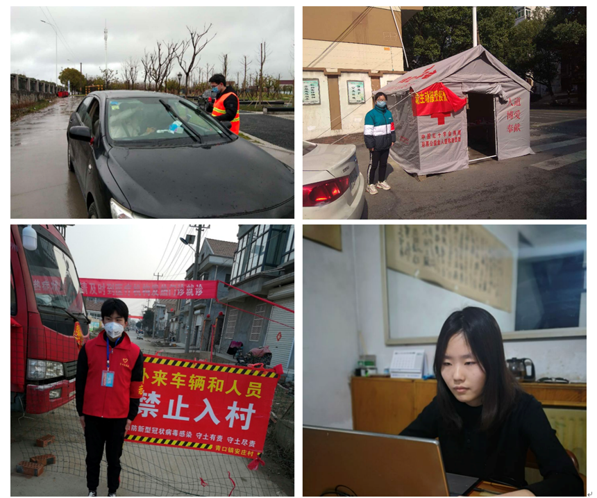电子信息191班安中秋同学,在疫情刚爆发后,义无反顾地参加了社区疫情防控志愿者,他每天都像上班一样站在村口检查村民进出戴口罩情况,如果有未戴口罩的村民,他都会上前去劝说,让村民认识到防疫工作刻不容缓。他说:“我虽然不能像白衣天使那样在前线为人民服务,但是抗击疫情,不仅是医疗卫生战线的事,而是全中国人民的事,我坚信 ‘国家有难,匹夫有责’,我要积极响应村里抗击疫情的号召,希望这场没有硝烟的战争快点结束。”信息工程181班张昊琳同学参加的是线上志愿者活动,主要任务是创作与防控疫情相关的作品,扩大防疫知识的宣传。她说:“在制作作品,收集素材时,也使自己对这次疫情有了更深的了解,不仅增加了防疫知识,还学会了要冷静判断网络信息的真假,努力做到不信谣、不传谣。虽然没有在一线为国家贡献自己的力量,但能参加线上的疫情防控志愿活动,心中也是激动的。”电子信息181班施徐伟同学积极加入到村委的疫情防控工作中,主要负责疫情防控值勤,隔一天需要执勤12小时,对过往的车辆进行排查,测量体温,车辆登记。经过多天的志愿活动,他深深地认识到疫情防控关乎着每一个人,更是对每个人的生命负责。通信工程(卓越)171班于心月同学,在疫情爆发后,写下请战书主动要求参与疫情防控工作。她在当地社区担任志愿者,主要负责工作是执勤测量体温,每天按时在站岗巡查过往车辆、人流、监测体温。她希望通过自己的一份力量和大家一起努力战疫,取得最后的胜利。