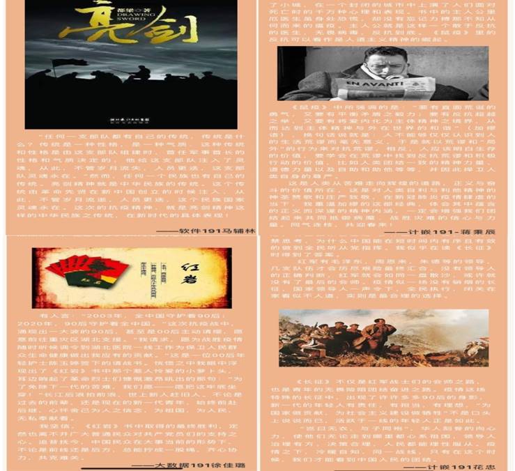 为加强学风建设,提倡阅读好书,分享阅读心得,该院举办了“抗疫读书记”活动,鼓励同学们把读书作为一种健康的生活方式,把修身养性作为一种战“疫”方式。软件工程191班马辅林同学分享了阅读《亮剑》的感受,他说:正是革命先烈们不惧强权、无谓生死、敢于“亮剑”的精神,支撑着中华民族对近代积贫积弱命运的抗争,今天,疫情下的“逆行者们”勇敢冲在抗疫前线,为广大人民群众筑起希望的高墙,这就是新时代的“亮剑精神”。大数据(嵌入式)191班徐佳璐同学分享了阅读《红岩》的感受,她说小说中饱含的“舍小家顾大家,国安心才安”的精神正是疫情当下无数白衣天使的真实写照,也展示出中国人民在危难来临之际,总能拧成一股绳,齐心协力、共克难关。同学们还分享了《共产党宣言》《长征》等作品的读后感,通过感受优秀作品的精神实质,共同坚定战胜疫情的决心,用青春的蓬勃姿态奋勇前行。