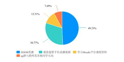 调查显示,学生较为青睐直播、学习录播视频等直观的线上授课方式,Moodle平台的资料学习也起到了重要作用,qq互动答疑是以上学习模式的补充。