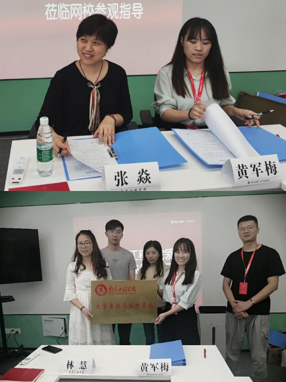 在学而思网校,人力资源阚凌博介绍了集团发展历程、科技理念以及核心岗位、薪资福利、未来展望等。2020届毕业生代表进行了经验分享,她表示在学而思,清晰的职业发展路径、和谐的企业氛围、良好的薪资待遇,让他们热爱工作,也收获成长。在感谢学校的培养的同时,也希望更多学弟学妹加入学而思。该院党委书记冯永伟在听完介绍和分享后赞扬了青年一代年轻有为,也感谢学而思为该院毕业生提供的平台与机会,他希望双方建立长足合作,实现“双赢”发展。会上,双方签订了共建大学生社会实践基地协议、共建高校毕业生就业基地协议,并就大学生社会实践基地进行了挂牌仪式。