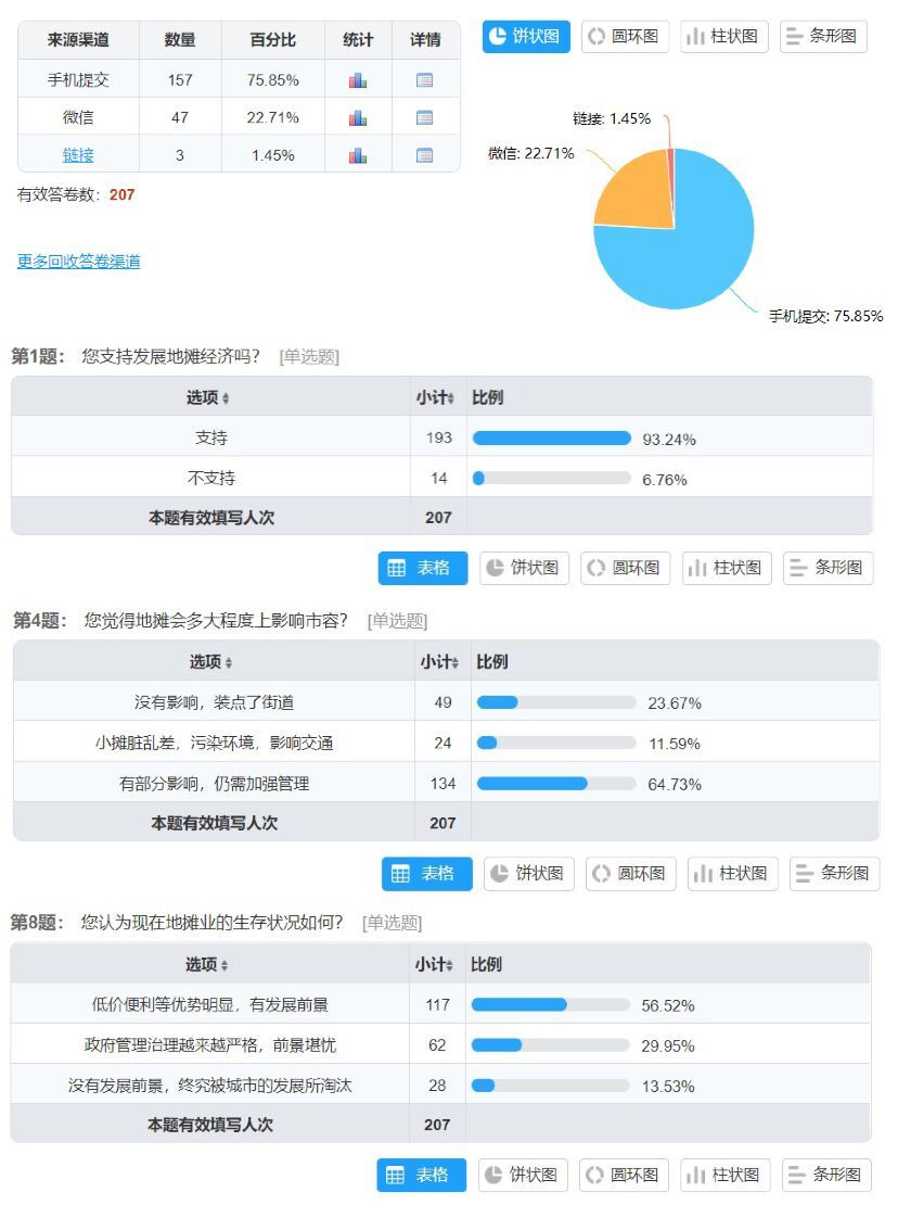调研团通过线上问卷调查和线下实地调研的形式,深入探索小地摊是如何关系大民生的。在线上问卷部分,调研团队针对不同人群从不同角度出发发放线上问卷;线下走访实地调研,则是对商户进行采访,结合反馈对地摊经济目前的发展现状进行更深层次的剖析并形成调研报告。在问卷调查和走访活动中,有95%的人认为地摊经济能够“聚人气促消费”,地摊经济看似微不足道,却对稳就业保民生有着一定作用,以地摊经济为代表的非正规经济承担着某种“社会润滑剂”的功能,为后疫情时期的社会带来更大的“弹性”。但同时,也有部分人认为伴随着地摊经济迅速崛起,占道经营、环境脏乱差、噪音扰民、食品安全等问题也可能会“卷土重来”,城管和食品安全检验部门需要加强监督管理。
