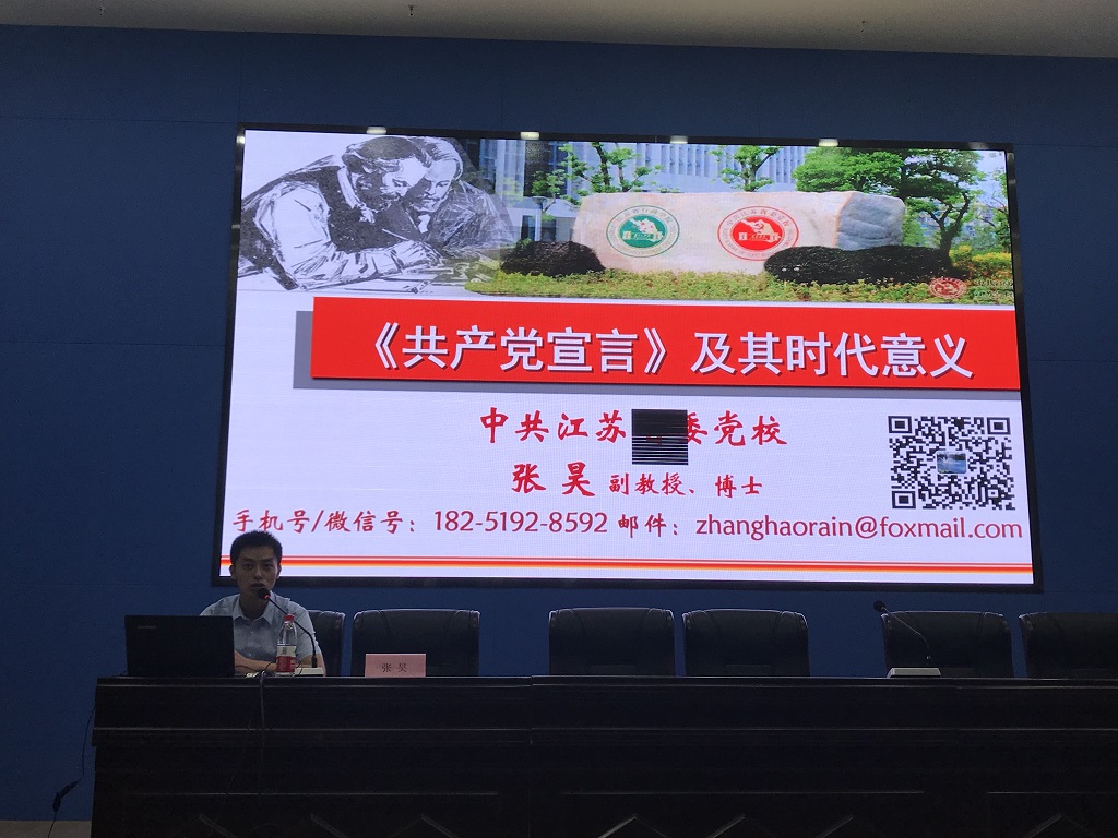 启动仪式后,中共江苏省委党校副教授,南京大学博士张昊带来《共产党宣言及其时代意义》讲座。张老师从陈望道翻译《共产党宣言》的故事开始,以详实的史料和生动的语言为大家讲述了《共产党宣言》诞生的历史背景和历史过程,介绍了它在马克思主义经典著作中的特殊地位,阐述了它对中国共产主义事业的发展发挥的重要作用。张老师还通过分析当前国际国内重大事件、中美贸易摩擦,以及现在资本主义国家面临的现实问题说明《共产党宣言》所具有的时代意义,并着重回答了“资本主义为什么还有生命力?”的问题。张老师指出,重温《共产党宣言》,就是要不忘初心、牢记使命,把“宣言”所蕴含的科学原理和科学精神运用到“四个伟大”的实践中去,不断谱写新时代坚持和发展中国特色社会主义新的篇章。