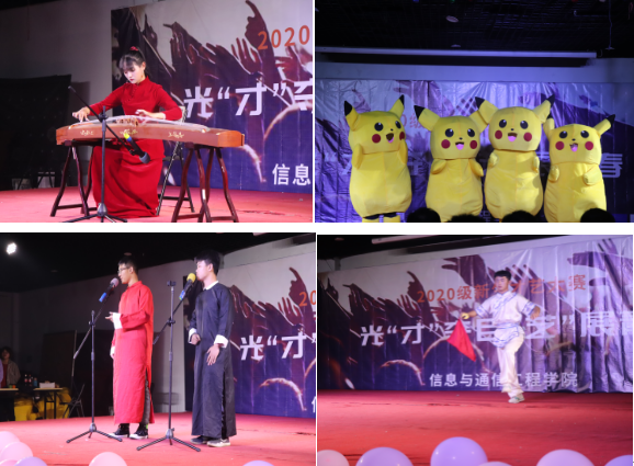 大赛于暖场曲目《大鱼》温柔细腻的歌声后正式开始,人工智能202班的魏文卓同学着一袭红衣为大家带来古筝独奏《战台风》,令观众们沉浸在古声古韵之中流连不已;由信息工程202班选送的相声《大一,新的开始》用幽默诙谐的语调将大学新生活娓娓道来,现场笑声不断;通信201班选送的传统武术表演向观众彰显了独属于中华武术的刚强魅力;舞蹈《皮卡丘》则是四位来自通信205班的同学扮演活泼可爱的皮卡丘,憨态可掬的舞姿将全场气氛推向了高潮;电信202和通信203选送的男生对唱,用深沉的嗓音演绎了一首《遗憾》,稳健的台风让观众们久久地沉浸在歌声里;人工智能201班选送的小品《学生会风云》再现招新现场的一幕幕真实场景,让同学们理解了学生会干部肩上的责任和担当;赛尾之际,人工智能202和信息工程201的同学为大家带来的吉他弹唱《南山南》于静谧中自留余韵。经过评选,舞蹈《皮卡丘》荣获一等奖,男生对唱《遗憾》和武术表演获二等奖,三等奖由古筝独奏《战台风》,萨克斯独奏《此情不移》和吉他弹唱《南山南》获得,现场老师为获奖选手颁发证书及奖励。
