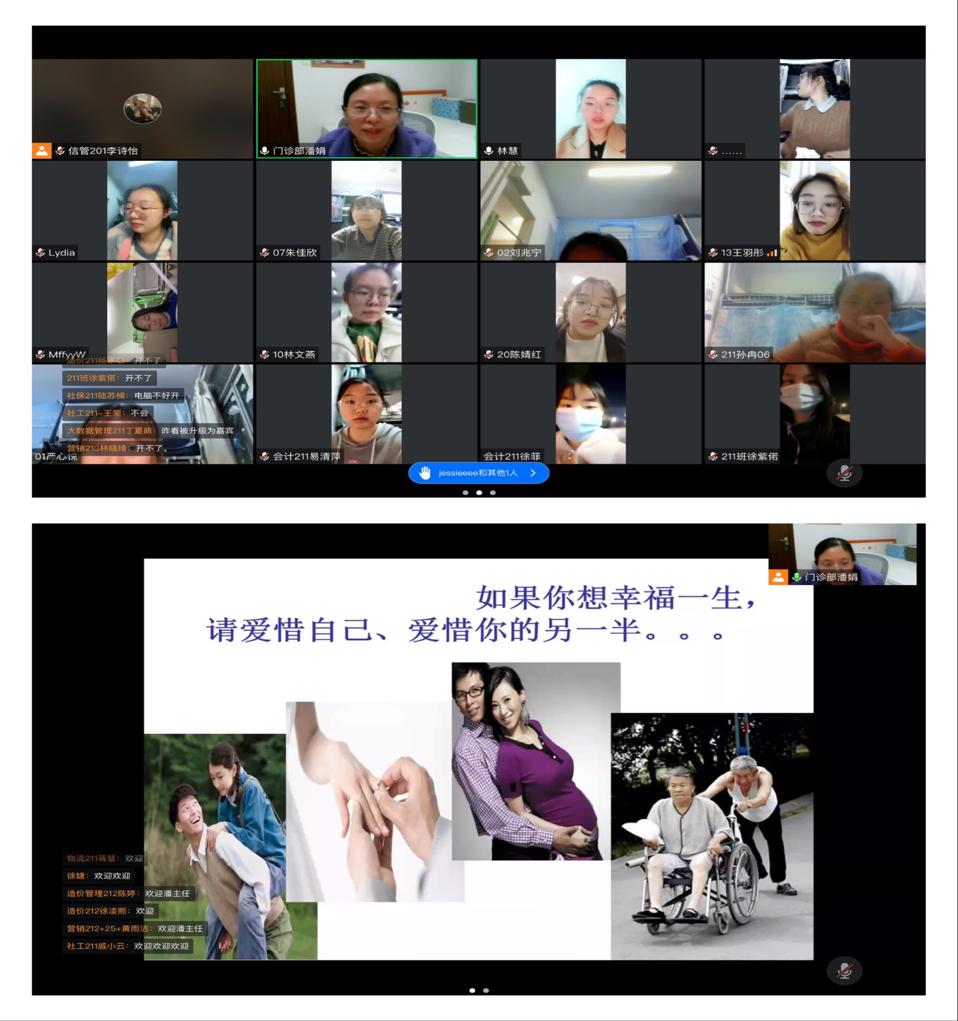 为了引导女生关爱自我,养成良好生活习惯,培养健康的生活态度,经济与管理学院召开线上女生专题讲座,特邀门诊部潘娟主任作为本次活动的主讲。讲座中,潘娟主任不仅帮助同学们分析了“喜欢”与“爱情”的区别,还结合相关病例科普了女性生理知识以及如何预防性骚扰。潘主任向同学们介绍了艾滋病的传播途径,提醒同学们加强自身防护,在关注生理健康同时,也要培养健康心态,做身心健康的阳光青年。“听了潘老师的讲座,我懂得了更多的女性知识,也明白了只有认真对待自己,才能拥有幸福快乐的大学生活。”一位同学听完讲座这样说。