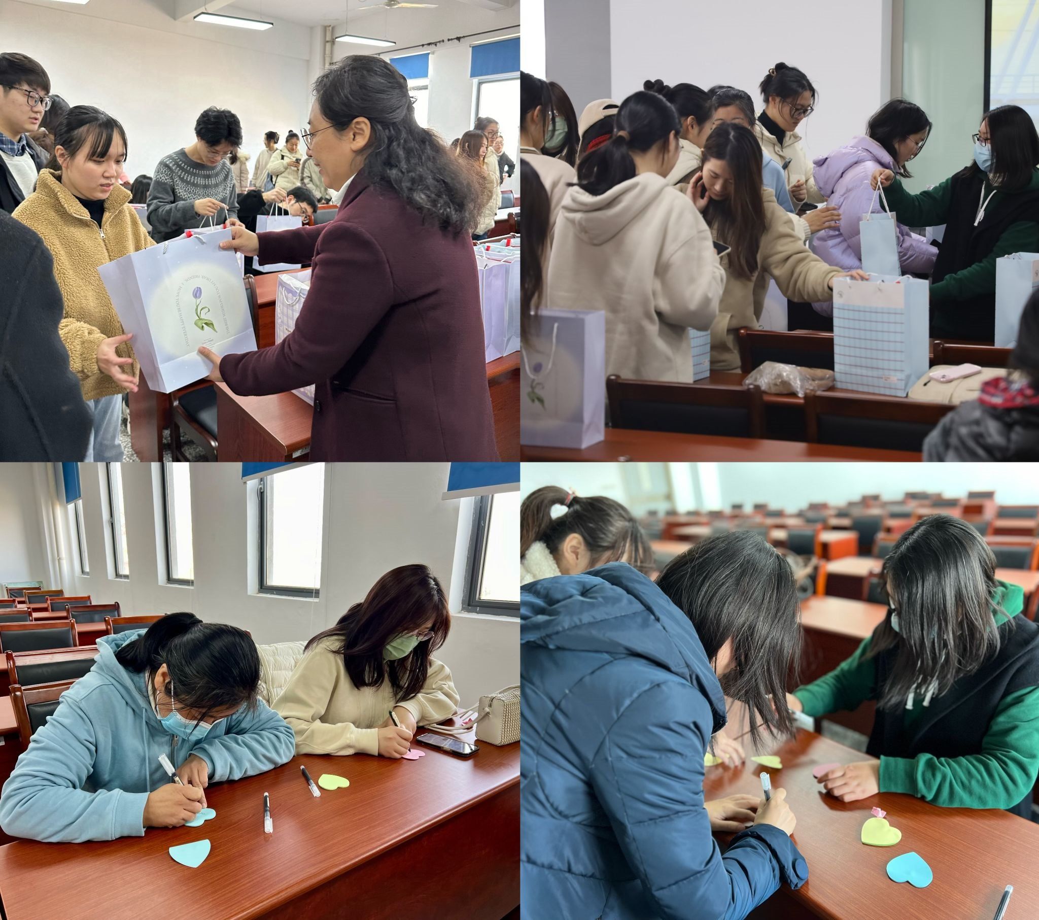 活动中,老师为同学们热情分发暖心大礼包,“考研文具、柿子、苹果、橙子、口罩、暖宝宝……大礼包中有老师们精心选取的七样礼品,取‘期上—期待上岸’之意,还有班主任手写的暖心加油便利贴,鼓励大家坚持到底,金榜题名。”收到诚意满满的祝福和礼包,英语201王科惊喜地说:“非常感谢备考以来学院给予的帮助和关心,在焦虑的学习之余收到了老师们送来的温暖,这不仅仅是礼包,更是鼓励与支持。我们将带着这份温暖的陪伴,以更加坚定的心态走下去。”