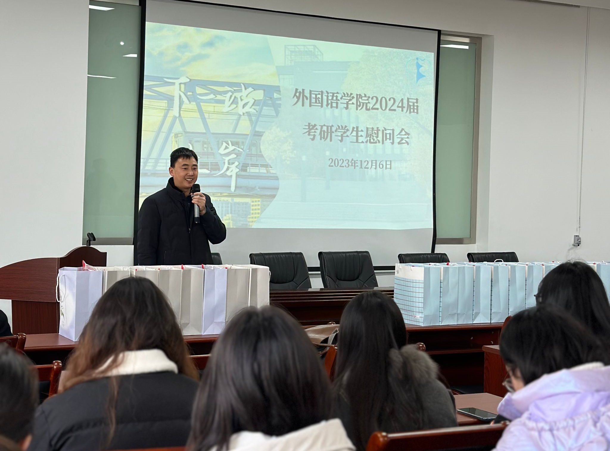 为鼓舞考研斗志、缓解备考压力,12月6日,外国语学院开展了“助力‘研’途梦,‘期’上青云端”考研慰问活动,为学子们送上暖心“礼包”,助力成功“上岸”。学院党政负责人、校关工委老师、毕业班班主任和辅导员、2024届考研学生代表参加活动。