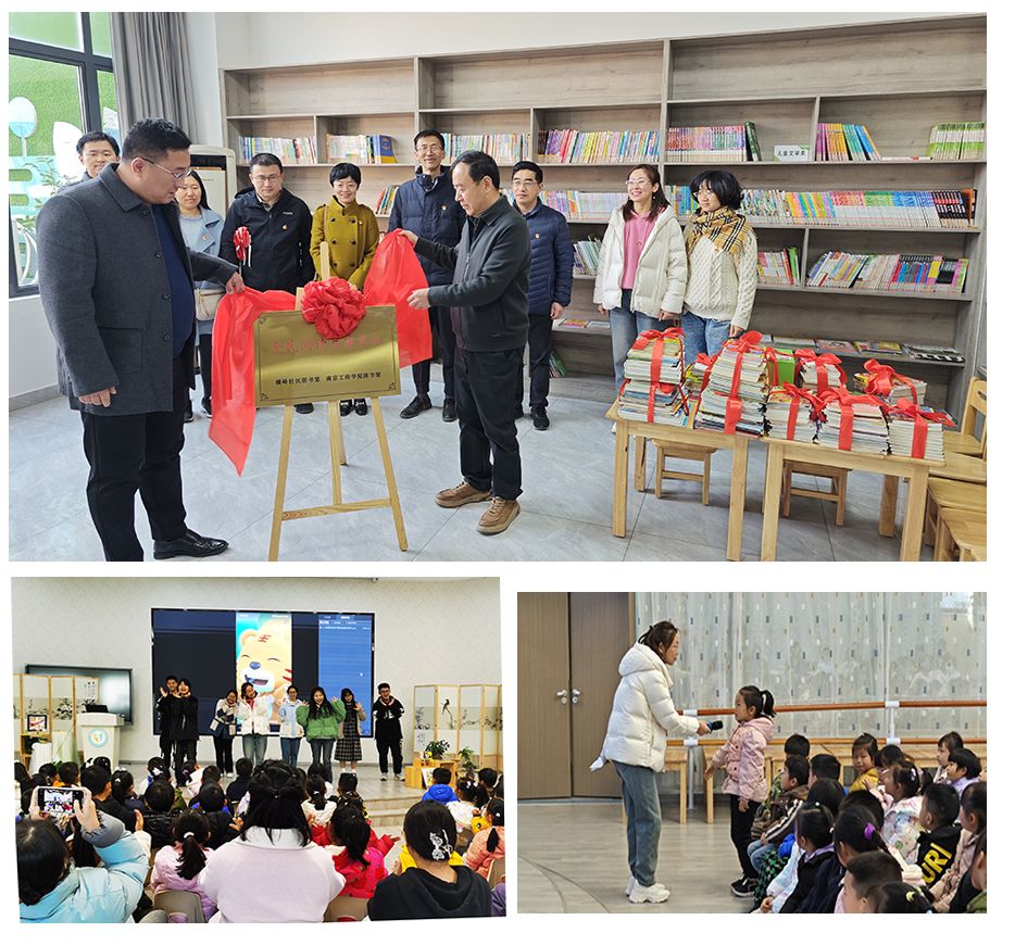 一行人首先来到横岭社区服务中心,将300余册儿童读物赠送给了社区图书室,这些儿童读物全部来源于党员和盟员们的个人捐赠,每一本都经过了精心挑选和细致整理,饱含了老师们对于孩子们的关心和爱护。读物内容丰富,既有经典童话、又有科普知识、还有文学启蒙,书本类型以儿童喜爱的绘本为主,既通俗易懂又生动有趣。活动现场,图书馆还与社区图书室举行了全民阅读共建单位揭牌仪式,标志着共建双方在推动全民阅读方面的深度合作,图书馆馆长、民盟南工程委员会主委刘建新表示,南工程图书馆将会为社区居民提供更多的阅读资源和服务,为建设书香社会贡献力量。