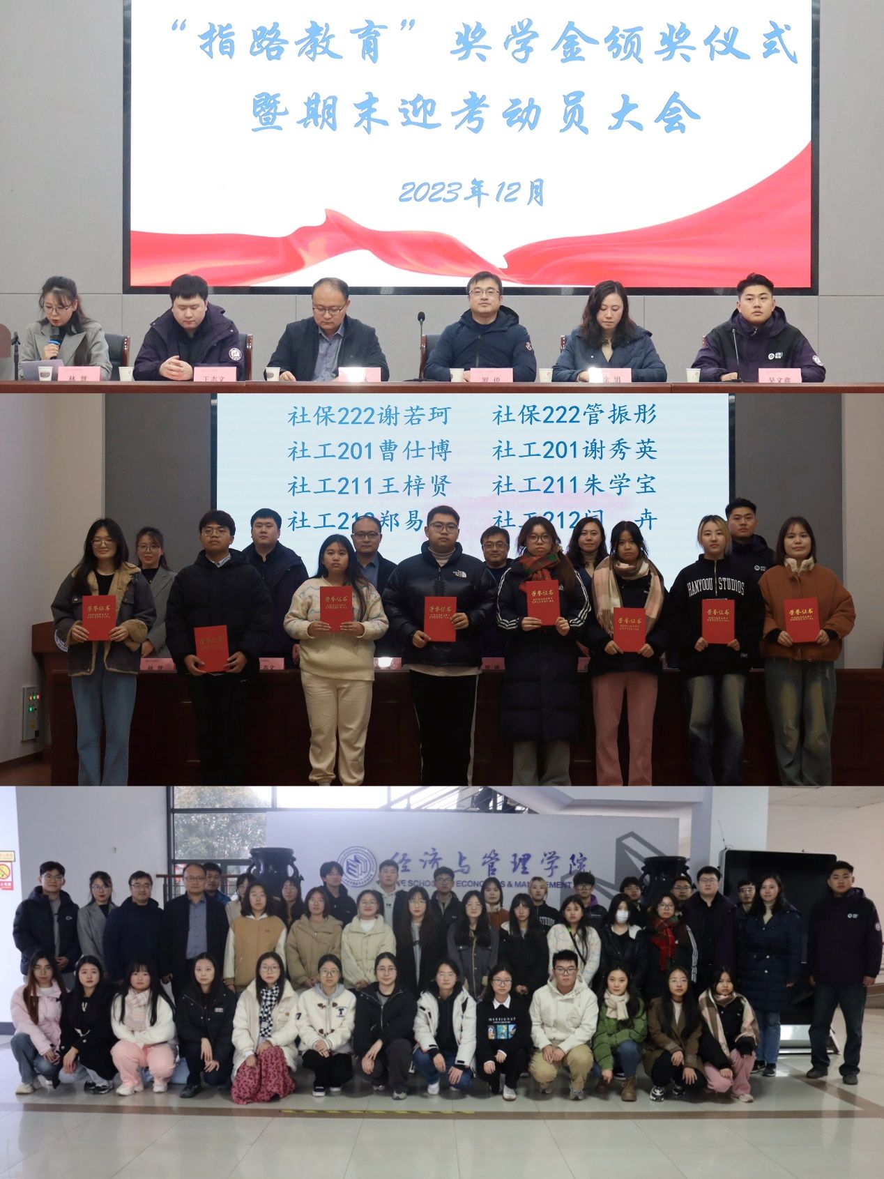 为了表彰先进,发挥榜样力量,营造积极备考良好育人氛围,12月14日,经济与管理学院举办2023年度指路教育奖学金颁奖仪式暨期末迎考动员大会。学院党委书记罗俊,党委副书记、院长张泳,党委副书记、副院长徐娟,指路教育咨询有限公司总经理王志文、市场总监吴文鑫,学院全体学工、各年级学生代表参会。