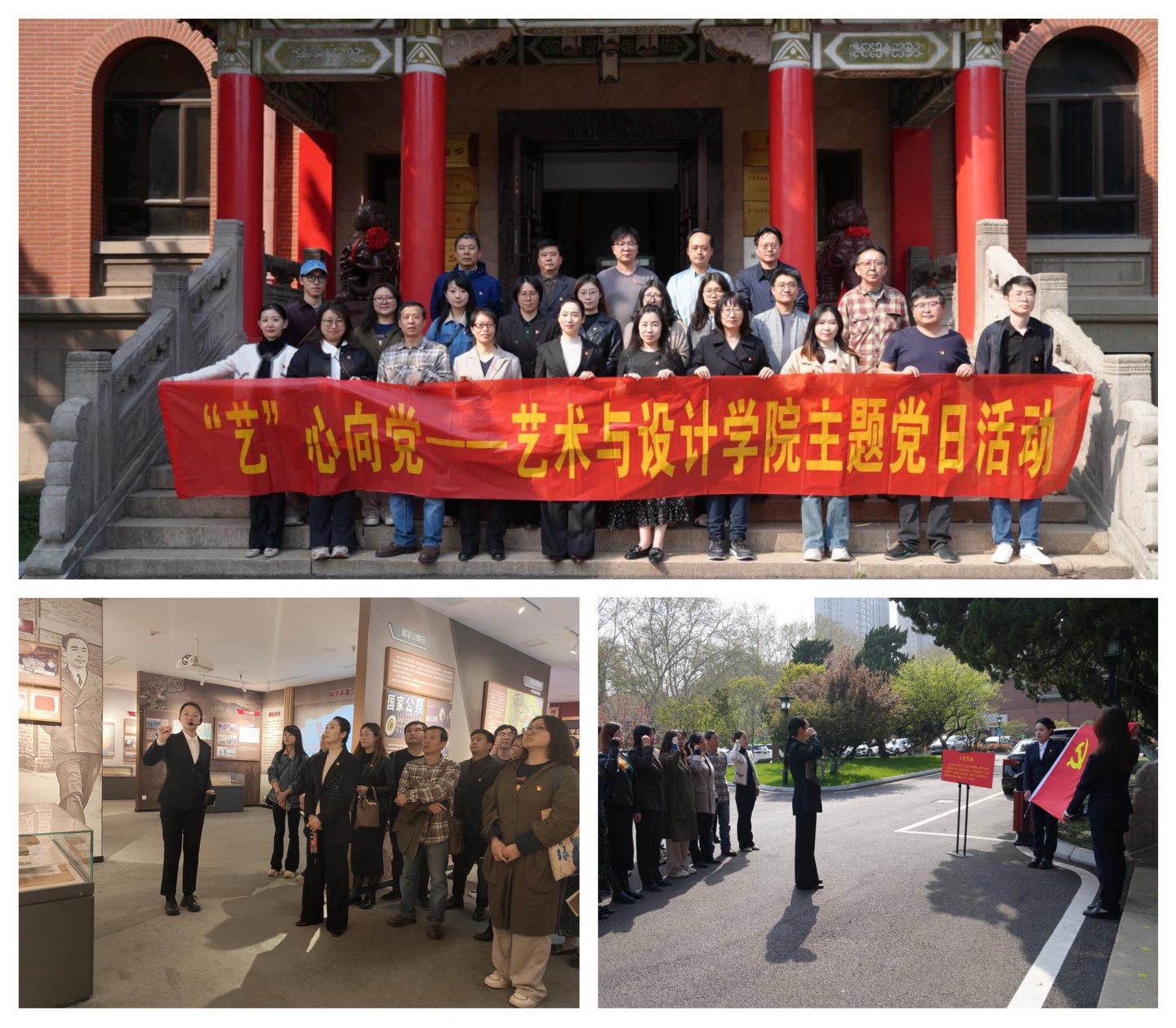 在讲解员的带领下,艺术与设计学院党员教师们参观了钟山宾馆集团省级党员干部教育实境课堂、江苏省爱国主义教育基地和“红岭”党建中心,详细了解“全面抗战决策地”“侵华日军战犯审判地”“国共和谈会议地”“渡江战役胜利后指挥地”“南京地下市委首次‘亮相地’”五个重大事件发生地的历史史实。党员们被一张张图文触动、感染,面对鲜红的党旗,再一次庄严地举起右手,重温入党誓词,回顾共产党人的初心使命。