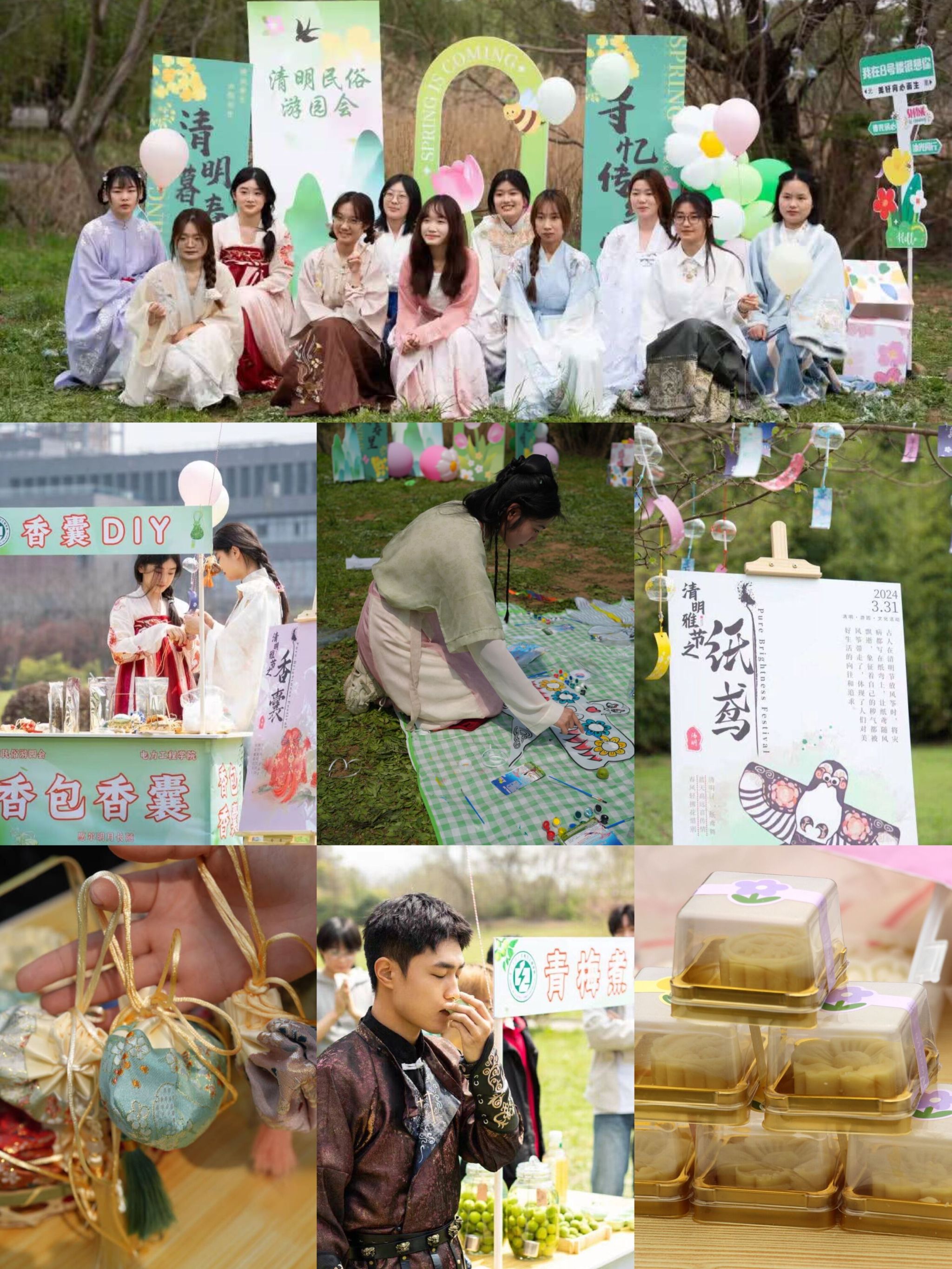 活动共分为“食在清明”“游在清明”“福在清明”三个板块,通过包青团、放纸鸢、制香囊、手工折纸、酿造青梅酒等活动,带领学生沉浸式体验清明民俗文化。活动现场,同学们身着传统汉服,体验投壶、蹴鞠等一系列传统民俗游戏,品味传统文化,感受清明的旖旎春光;把艾草装进纱袋,携棉花装入囊中,打一个春意结,嗅淡淡艾草香,体验香囊DIY的乐趣;挥动画笔、调制颜料,画出精美图案,自己动手组装风筝骨架、风筝线、转轴,在绘制纸鸢时留住春天;裁剪、折叠,将一张张彩纸做成一个个立体的花朵,让浓浓的思念以花朵的形式在手中绽放;搅拌青团粉,裹上豆沙或芝麻馅,搓成圆子,一口糯韧绵软,用舌尖开启春天之旅。“听说春天里第一次吃青团叫做‘尝春’,平安喜乐都会如约而至。”电力(中外)222班朱星宇同学一边包着青团,一边兴奋地跟大家说着。
