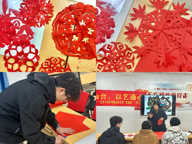 以纸为台,以艺通心。该院邀请学院常素老师来到北九“一站式”学生社区举办“以纸为台,以艺通心”主题成长引领微课堂,激发大学生对优秀传统文化的热爱。课堂上,常老师介绍了中国剪纸的历史、形式以及工具的使用,科普了中国剪纸知识,并传授了简单的剪纸技巧。在实践环节中,参与的同学和老师构思精巧,一裁一剪,一张张精美的剪纸作品诞生了。“没想到剪纸有这么多技巧,可以剪得这么好看!作为艺设学子,更有责任来弘扬和传承像剪纸技艺等中华优秀传统文化。”同学们纷纷表示。