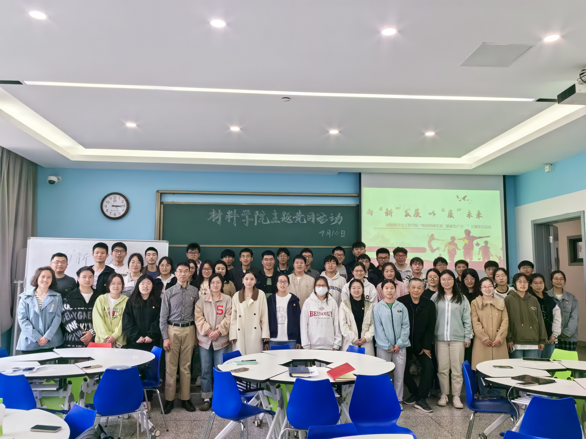 4月10日,材料科学与工程学院开展“向‘新’而行,以‘质’致远”主题党日活动,活动邀请学院退休老教师、在职青年教师、在校学生等近50名党员代表会聚一堂,共话“新质生产力”。