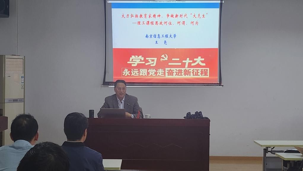 4月17日,南京信息工程大学原党委副书记、副校长(正校级),中国高教学会教育数学专业委员会副理事长,教育部本科教育教学审核评估专家,博士生导师王尧教授应邀来到文理楼B302,为数理学院师生作主题为“理工课程思政---何位,何谓,何为”的学术报告。报告由数理学院副院长张康群主持,数理学院和相关院系部分骨干教师、学生代表共计100余人参加。