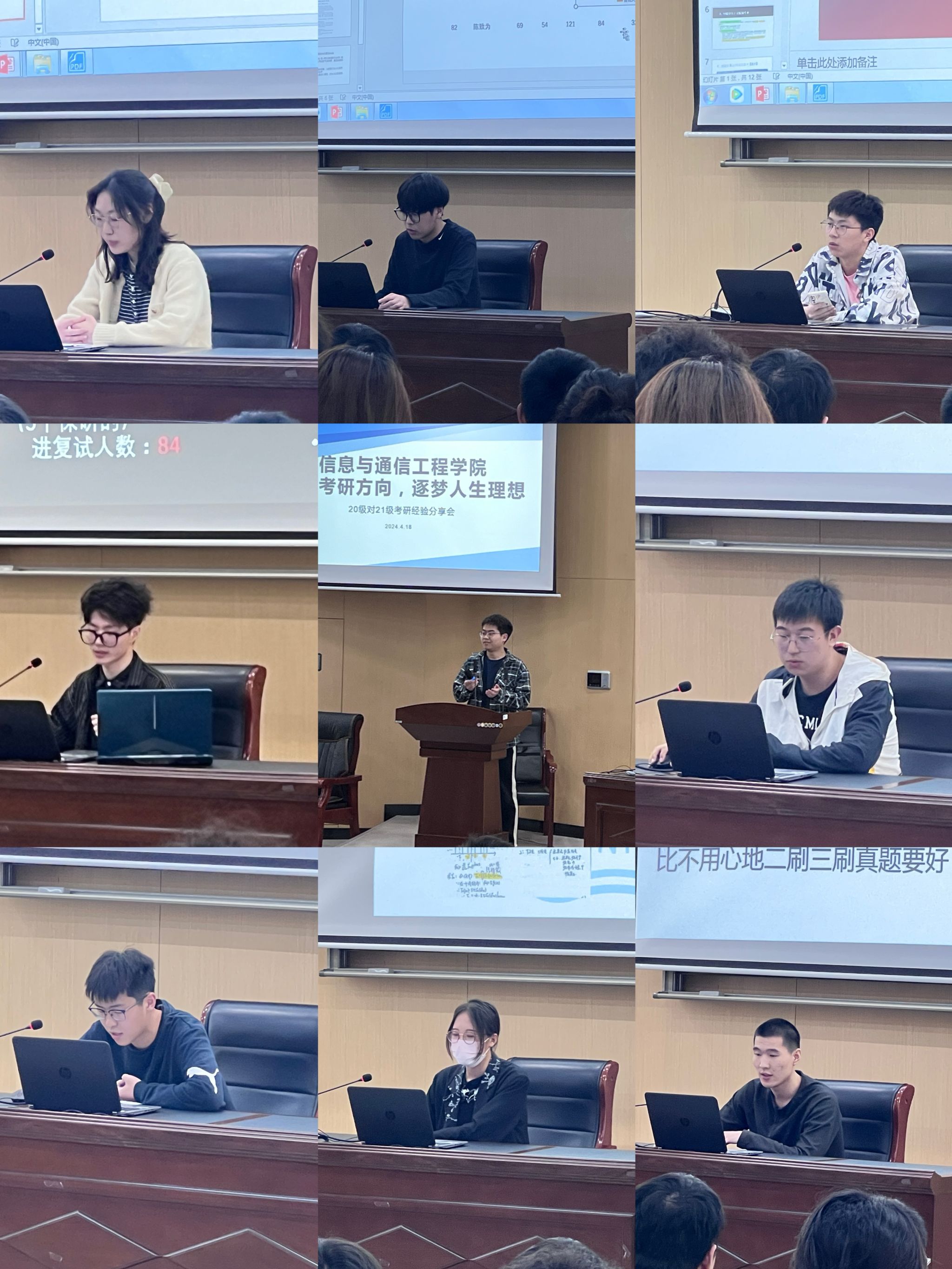 为进一步发挥朋辈榜样的示范引领作用,培育优良学风,激发学生学习内驱力,增强考研信心,4月18日至22日,信息与通信工程学院在信息楼B103举办了“朋辈面对面”考研经验分享活动,活动邀请成功考取研究生的26位优秀学生代表与同学们进行经验分享和交流。学院党政负责人、辅导员全程参与,近三百名学生参与此次活动。