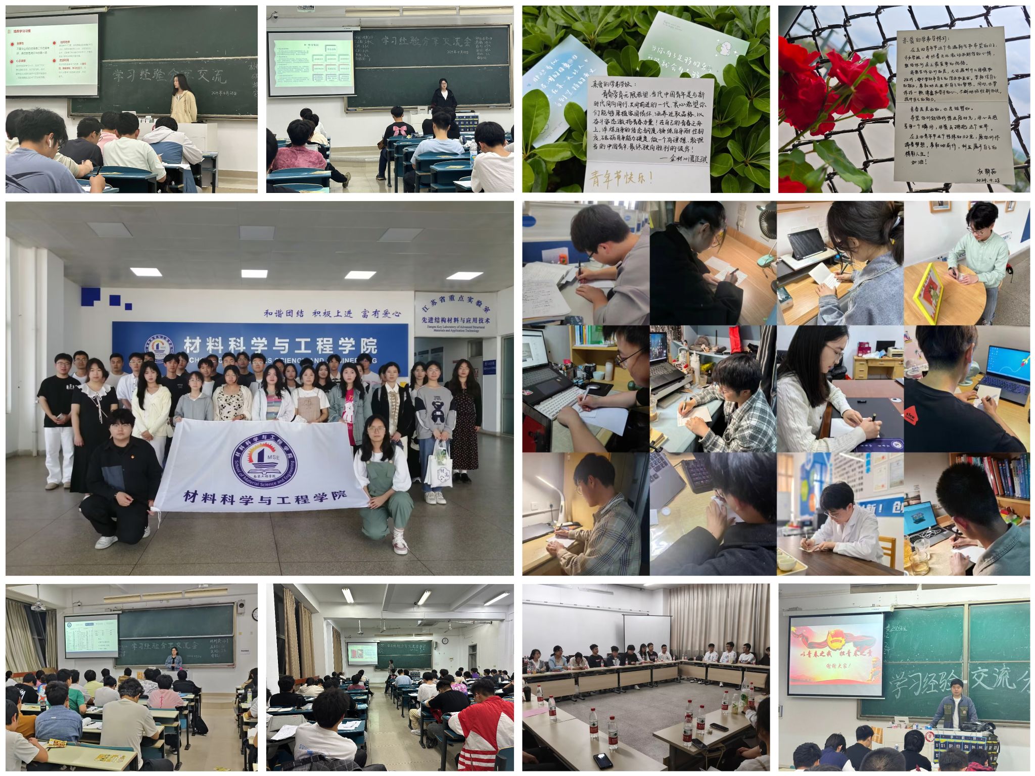 青春正当时,奋进不停歇。学院组织开展了“青年寄语信”“青年互助会”“青年座谈会”等活动,引导广大学子进一步将五四精神落实到学习生活中。在“青年寄语信”活动中,学院邀请以“中国大学生自强之星”为代表的2020级优秀青年为大一学弟学妹撰写青年寄语。“在五四青年节这个特殊的日子里,愿你们怀揣梦想,勇敢前行,创造属于自己的精彩人生!”这些书信围绕大学生活、学习、职业规划等多个方面,分享了他们的生活经验和建议,并鼓励新生们勇敢前行,创造精彩人生。“青年互助”学习经验分享会上,荣获学业助力奖学金的优秀学子详细介绍了如何高效记忆、管理时间和应对学习压力等方面的技巧,分享他们的学习心得和方法。青年座谈会上,同学们与南京晓庄学院青年学生骨干就如何在科技创新、乡村振兴、绿色发展、精神文明建设等领域发挥青年力量进行了深入探讨。“学生会组织肩负着引领广大同学投身社会主义现代化建设的青春使命,两院学生会要共享优秀经验,全心服务同学成长,从同学们在学业进步、就业发展、社会融入和身心健康等问题出发,做精做细做实一批‘小而美’的服务,体现‘优而精’的项目。”材料学院学生会青年学生干部钮越捷分享道。