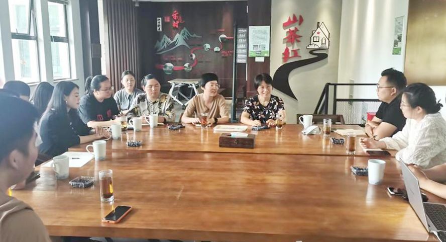 随后,学院一行前往江宁街道朱门社区开展美丽乡村调研。朱门社区党总支书记张磊带领大家参观了党群微家,在非遗传承实习基地聆听了雨花茶技能大师王永刚对茶叶制作技艺的讲解,深入了解了朱门社区依托资源优势,扎实推进宜居宜业美丽乡村建设取得的新成果。经管学院沈建红教授结合专业,对如何打造、推广“山茶红”品牌给出了建议。双方就如何依托学生专业实践、市场营销大赛等途径促进农文旅宣传推广进行了深入探讨,表示将以此次调研为契机,持续开展学习互访、项目合作等,聚集实际问题,合力推进美丽乡村建设。
