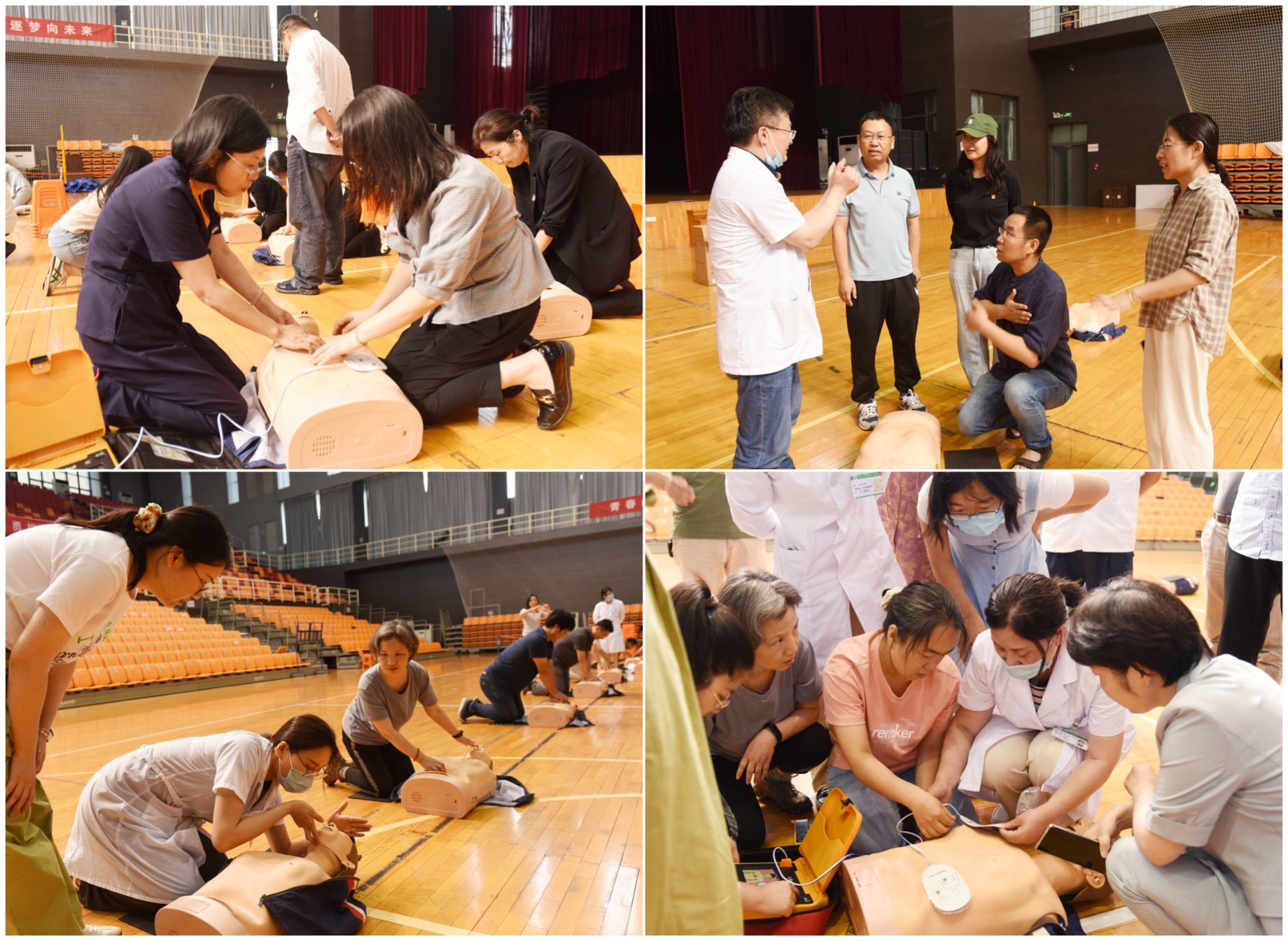 本次演练活动分为理论授课和实操演练两个部分。在理论授课环节,许凯莉医师从生活中发生心脏骤停的案例引入,深入讲解了心跳呼吸骤停发生的机理、黄金急救时间、心肺复苏术(CPR)救助步骤、自动体外除颤器(AED)使用方法以及海姆立克急救法等关键知识。她说,发生紧急情况时,掌握基本的急救技能对于保障生命安全至关重要,但也要确保自身处于安全环境,筑起牢固的生命防线。在实操演练环节,门诊部的医师们演示了心肺复苏术、海姆立克急救法等技能,并借助心肺复苏训练模拟人等医疗器械,指导教职工进行实践操作。医师们耐心细致地纠正了大家在胸外按压、异物清除、人工呼吸等施救过程中的不规范操作,确保每位参与者都能正确掌握相关技能。