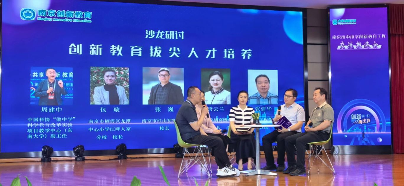 大会现场,张建华与龙潭中心小学江畔人家分校校长包璇,红山初级中学校长张巍,田家炳高级中学校长唐云兰,东南大学教授、中国科协“做中学”科学教育改革实验项目教学中心常务副主任周建中参与了主题为“创新教育拔尖人才培养”的研讨沙龙,沙龙由周建中主持。现场嘉宾共同探讨了义务教育及高中教育中多元化创新教育课程、平台、评价机制以及培养、选拔高质量人才等热门话题。