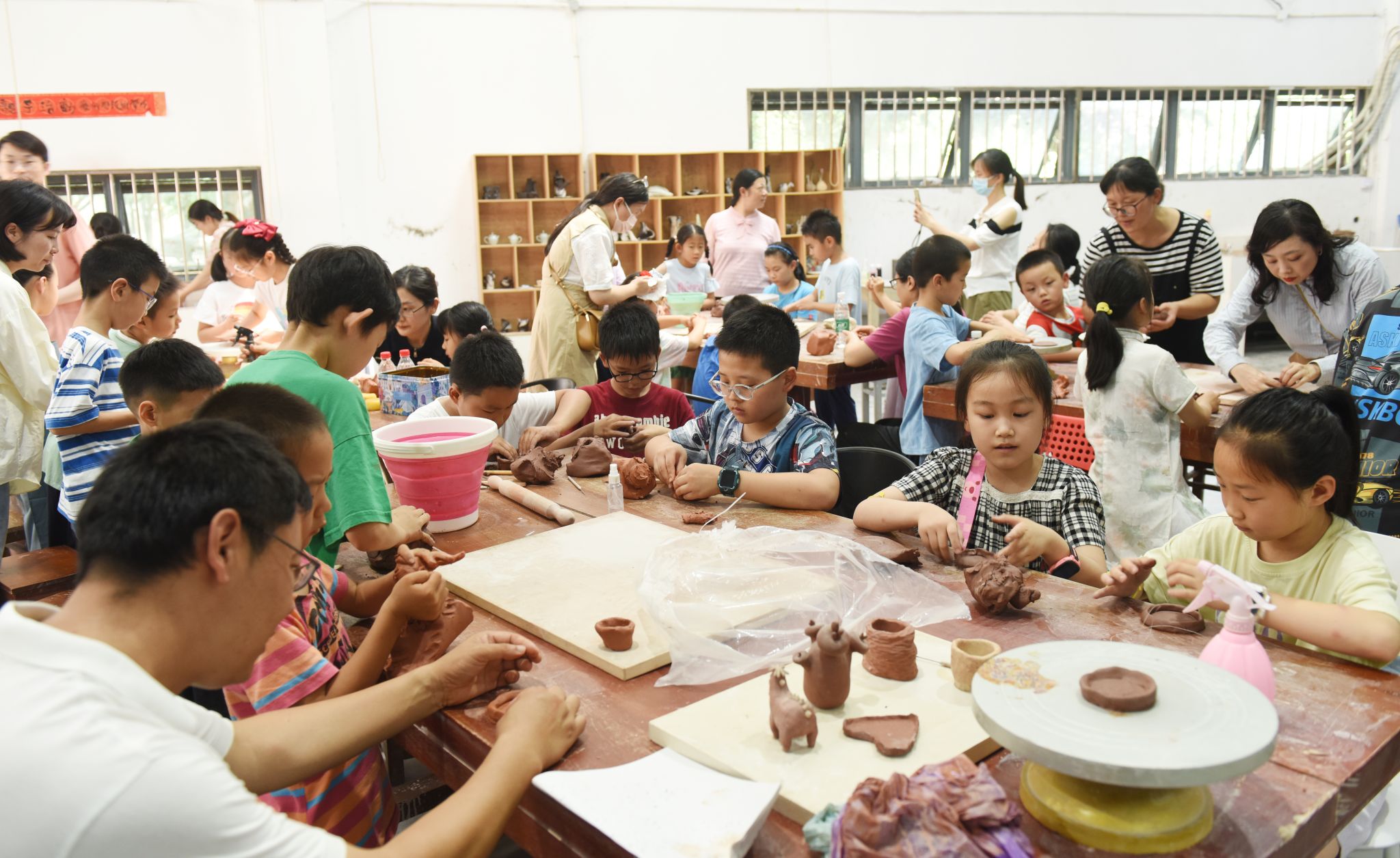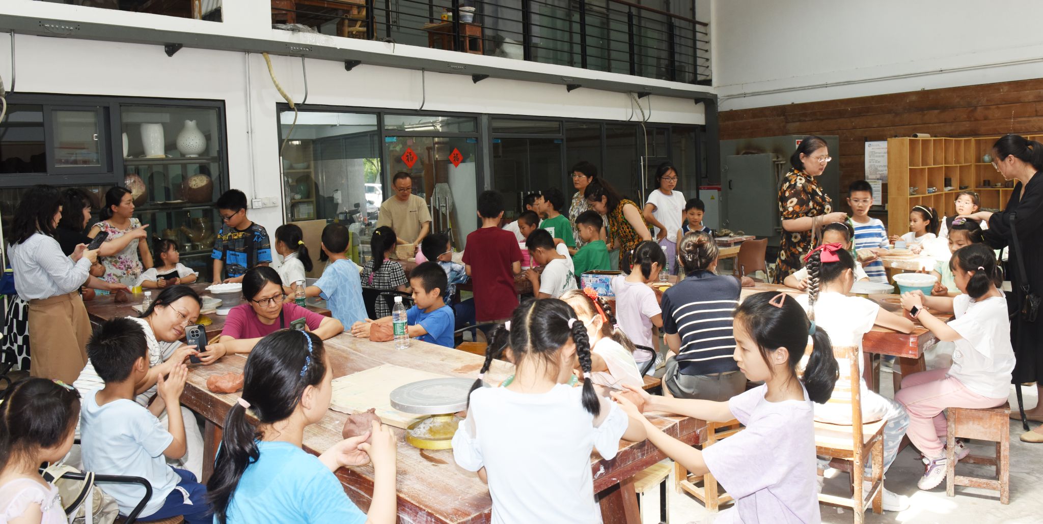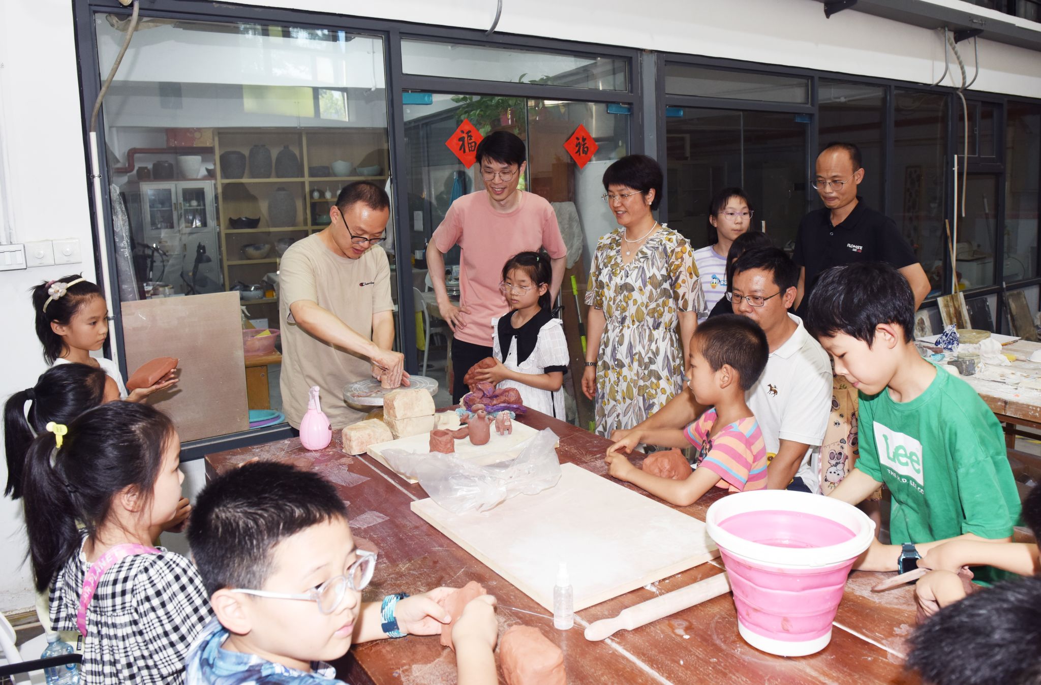 为进一步推动机关家庭家教家风建设,构建暖心关爱、温馨和谐的家庭关系,营造文明和谐、积极向上的校园文化氛围,机关一、二分工会组织开展“童”行趣坊活动。7月5日,首期活动在艺术与设计学院陶艺工作室开班,50多名教职工及其子女参加了陶艺制作体验活动。